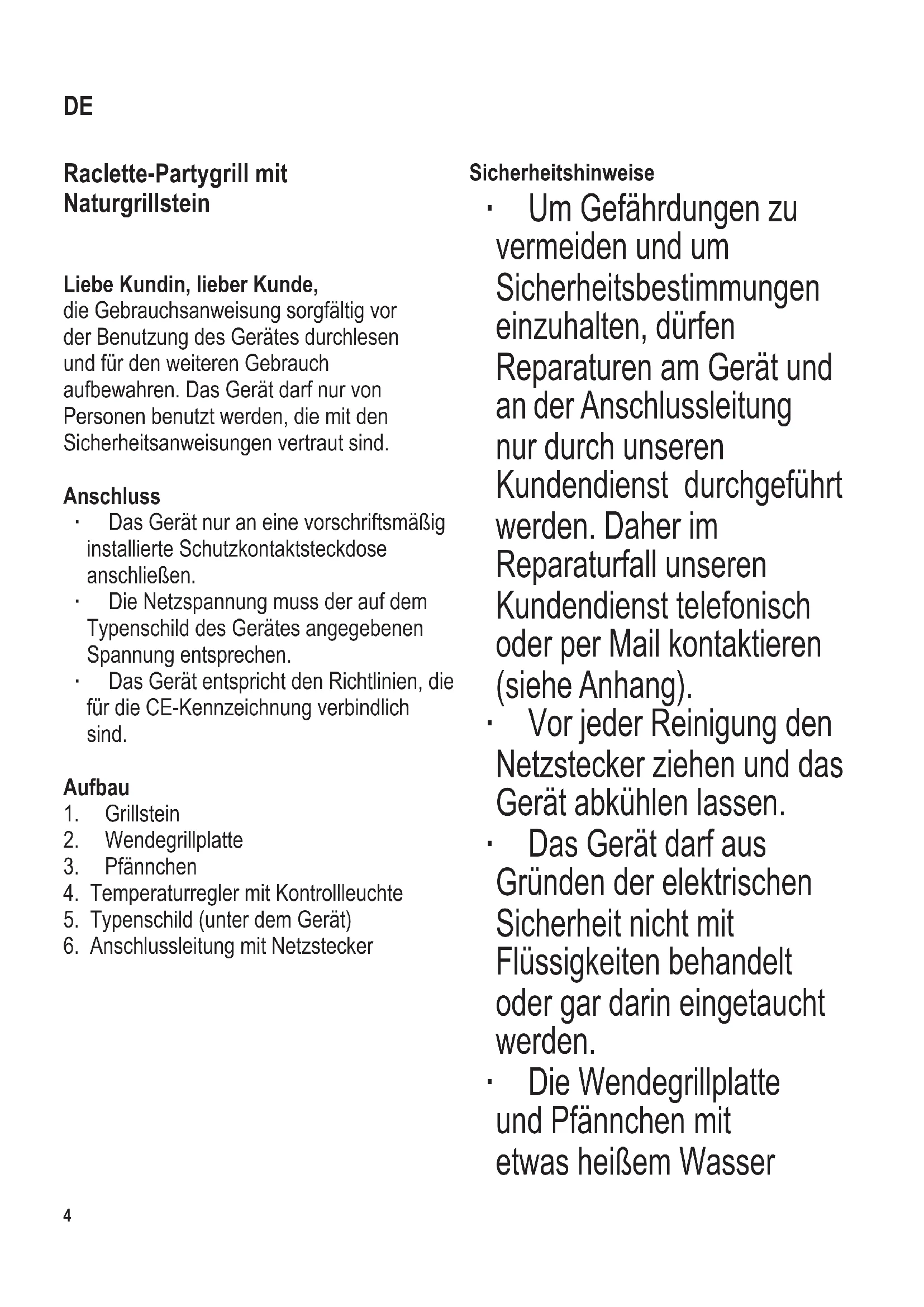 104 x 142 mm Raclette-Partygrill mit Naturgrillstein Liebe Kundin, lieber Kunde, die Gebrauchsanweisung sorgfältig vor der Benutzung des Gerätes durchlesen und für den weiteren Gebrauch aufbewahren. Das Gerät darf nur von Personen benutzt werden, die mit den Sicherheitsanweisungen vertraut sind. Anschluss ∙ Das Gerät nur an eine vorschriftsmäßig installierte Schutzkontaktsteckdose anschließen. ∙ Die Netzspannung muss der auf dem Typenschild des Gerätes angegebenen Spannung entsprechen. ∙ Das Gerät entspricht den Richtlinien, die für die CE-Kennzeichnung verbindlich sind. Aufbau