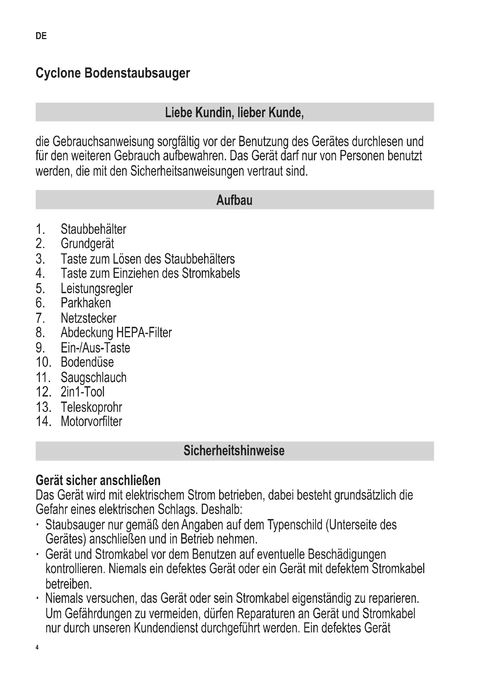 Das abgekühlte Gerät kann wieder eingeschaltet werden. Gerät nimmt kaum Schmutz auf bzw. Saugleistung lässt merklich nach Der Staubbehälter muss geleert werden (siehe „Staubbehälter leeren/reinigen“). Es empehlt sich, bei dieser Gelegenheit die Filter gleich mit zu reinigen (siehe „Filter reinigen oder ersetzen“). Bei aufgesteckter Bodendüse steht der Umschalter „Teppich/Hartboden” in einer dem Belag nicht angemessenen Stellung. Korrekte Schalterstellung wählen. Beim Saugen entsteht Geruch oder es tritt sogar Staub aus dem Gerät aus Wahrscheinlich wurden Teile des Staubbehälters oder des Saugerzubehörs, die für Filterreinigung oder Zubehörwechsel demontiert wurden, nicht wieder korrekt eingebaut oder geschlossen. Alle Teile auf festen Sitz und Halt kontrollieren. ∙ Wenn das nicht weiterhilft, wenden Sie sich an unseren Kundendienst. ∙ Die Kontaktdaten nden Sie im Anhang dieser Gebrauchsanleitung oder auf unserer Homepage. Ersatzteile, Garantie und Entsorgung Ersatzteile und Zubehör Ersatzteile oder Zubehör können bequem im Internet auf unserer Homepage www.severin.de unter dem Unterpunkt „Service / Ersatzteile“ bestellt werden. 5103-048: 1 Staubbehälter-Filter + 1 HEPA-Filter PB7217: 1 Parkettdüse TB7216: 1 Turbobürste ZB7214: 1 lange exible Fugendüse10 142 x 208 mm Entsorgung Geräte, die mit diesem Symbol gekennzeichnet sind, müssen getrennt vom Hausmüll entsorgt werden. Diese Geräte enthalten wertvolle Rohstoffe, die wiederverwertet werden können. Eine ordnungsgemäße Entsorgung schützt die Umwelt und die Gesundheit Ihrer Mitmenschen. Ihre Gemeindeverwaltung bzw. Ihr Fachhändler gibt Auskunft über die ordnungsgemäße Entsorgung. Garantie Von den nachfolgenden Garantiebedingungen bleiben die gesetzlichen Gewährleistungsrechte gegenüber dem Verkäufer und eventuelle Verkäufergarantien unberührt. Wenden Sie sich im Garantiefall daher direkt an den Fachhändler. Zusätzlich gewährt SEVERIN eine Herstellergarantie von zwei Jahren ab Kaufdatum. In diesem Zeitraum beseitigen wir kostenlos alle Mängel, die nachweislich auf Material- oder Fertigungsfehlern beruhen und die Funktion wesentlich beeinträchtigen. Weitere Ansprüche sind ausgeschlossen. Von der Garantie ausgenommen sind: Schäden, die auf Nichtbeachtung der Gebrauchsanweisung, unsachgemäße Behandlung oder normalen Verschleiß zurückzuführen sind, ebenso leicht zerbrechliche Teile wie z. B. Glas, Kunststoff oder Glühlampen. Die Garantie erlischt bei Eingriff nicht von SEVERIN autorisierter Stellen. Sollte eine Reparatur erforderlich werden, setzen Sie sich bitte telefonisch oder per Mail mit unserem Kundendienst in Verbindung. Die Kontaktdaten nden Sie im Anhang der Anleitung.11 142 x 208 mm Cyclone vacuum cleaner Dear Customers, Before using the appliance, read the instructions carefully and keep them for future reference. The appliance may only be used by persons who are familiar with the safety instructions. Structure