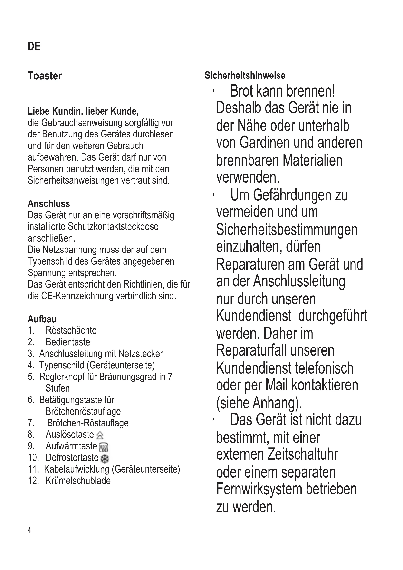 104 x 142 mm Toaster Liebe Kundin, lieber Kunde, die Gebrauchsanweisung sorgfältig vor der Benutzung des Gerätes durchlesen und für den weiteren Gebrauch aufbewahren. Das Gerät darf nur von Personen benutzt werden, die mit den Sicherheitsanweisungen vertraut sind. Anschluss Das Gerät nur an eine vorschriftsmäßig installierte Schutzkontaktsteckdose anschließen. Die Netzspannung muss der auf dem Typenschild des Gerätes angegebenen Spannung entsprechen. Das Gerät entspricht den Richtlinien, die für die CE-Kennzeichnung verbindlich sind. Aufbau