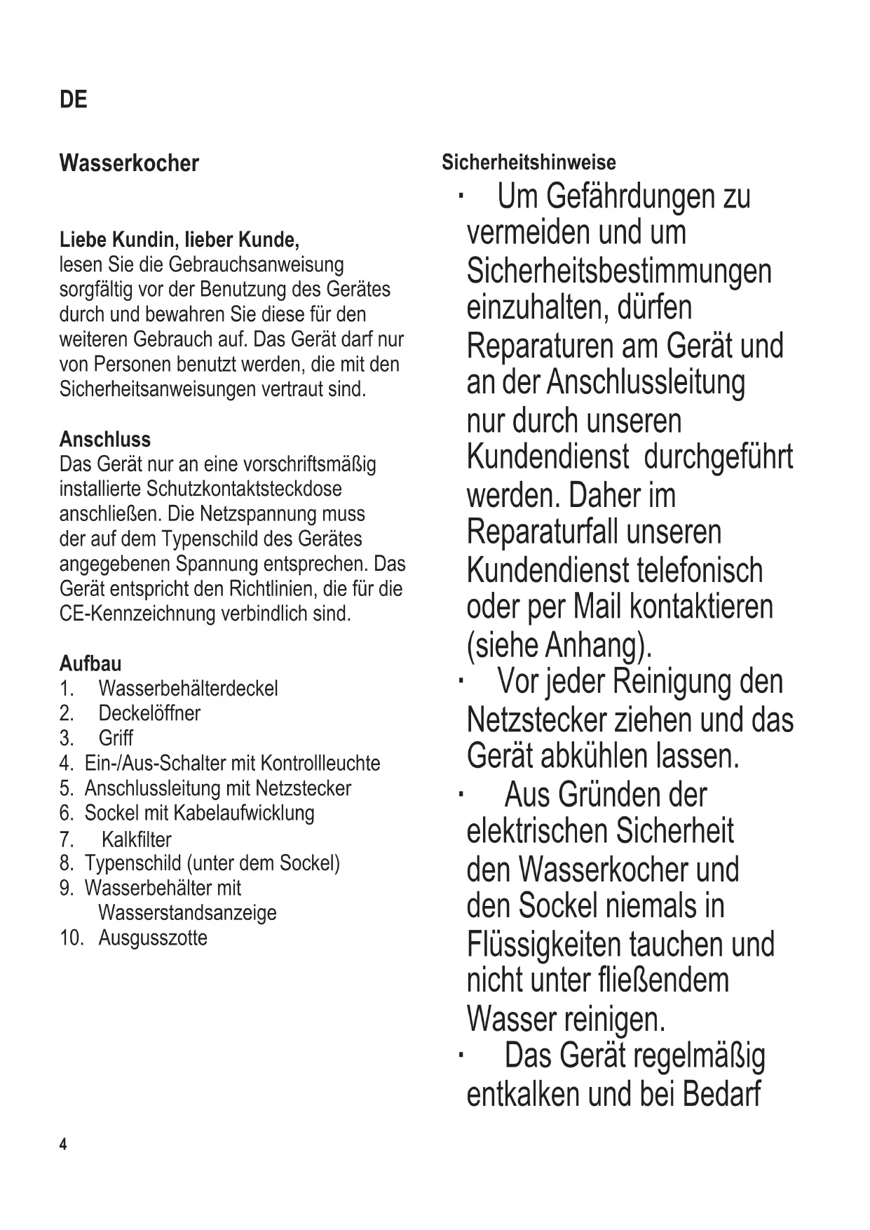 Sicherheitshinweise ∙ Um Gefährdungen zu vermeiden und um Sicherheitsbestimmungen einzuhalten, dürfen Reparaturen am Gerät und an der Anschlussleitung nur durch unseren Kundendienst durchgeführt werden. Daher im Reparaturfall unseren Kundendienst telefonisch oder per Mail kontaktieren (siehe Anhang). ∙ Vor jeder Reinigung den Netzstecker ziehen und das Gerät abkühlen lassen. ∙ Aus Gründen der elektrischen Sicherheit den Wasserkocher und den Sockel niemals in Flüssigkeiten tauchen und nichtunterießendem Wasser reinigen. ∙ Das Gerät regelmäßig entkalken und bei Bedarf DE104 x 142 mm