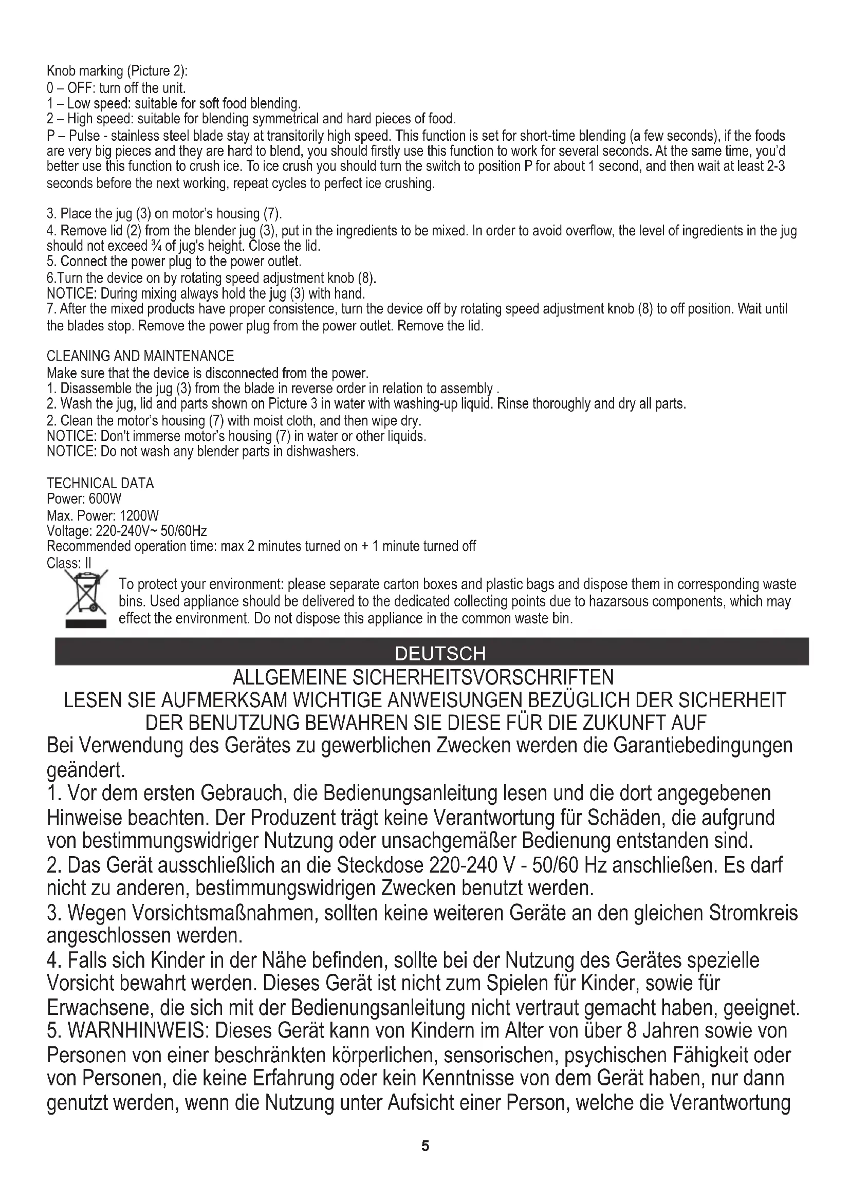 4. Lassen Sie den Mixer nicht länger als 2 Minuten ununterbrochen laufen. Lassen Sie das Gerät später mindestens 1 Minute abkühlen. 6. Überfüllen kann den Betrieb blockieren. Schalten Sie das Gerät aus und ziehen Sie den Stecker heraus, nehmen Sie etwas Essen heraus und arbeiten Się dann. NUTZUNG: 2. Waschen Sie den Krug und den Deckel in warmem Wasser mit Spülmittel, spülen Sie ihn gründlich aus und trocknen Sie ihn innen und außen.
