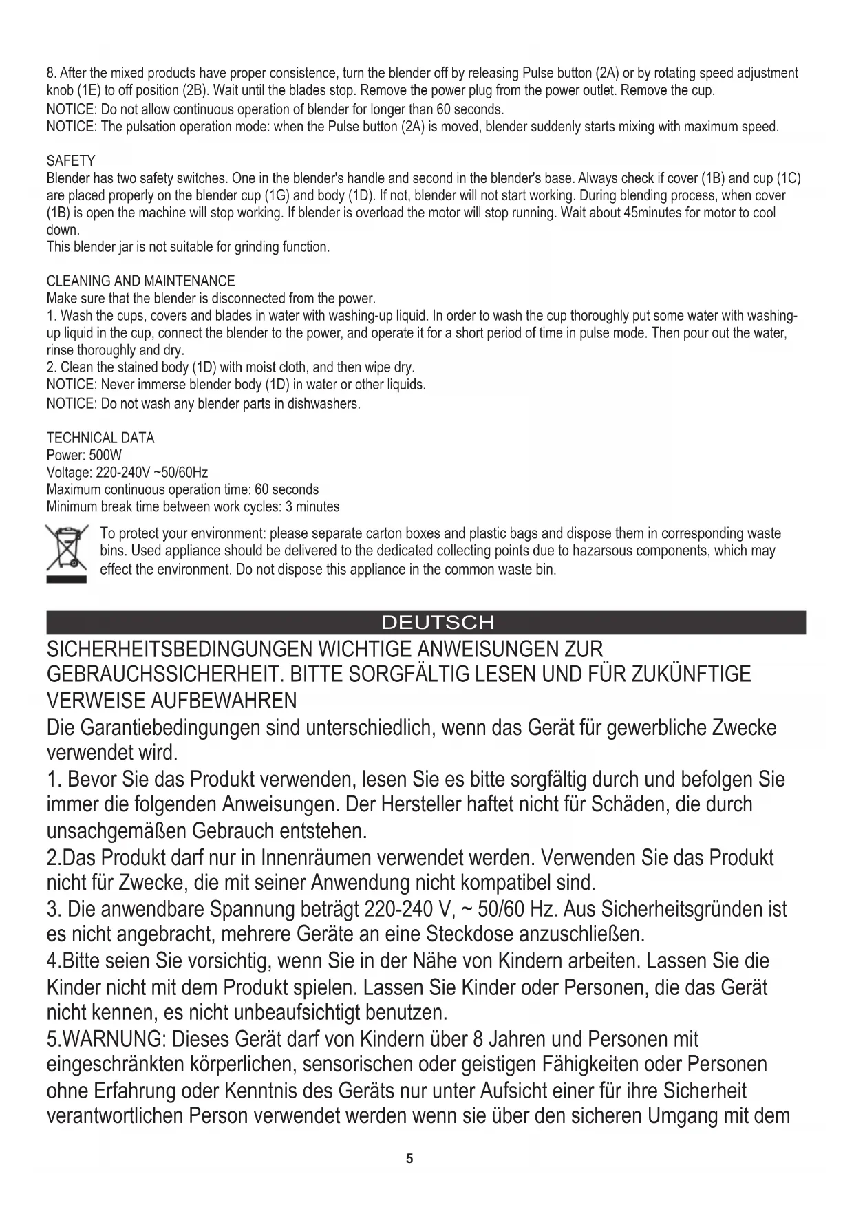 8. Nachdem die gemischten Produkte die richtige Konsistenz haben, schalten Sie den Mixer aus, indem Sie die Impulstaste (2A) loslassen oder den Geschwindigkeitsregler (1E) in die Aus-Position (2B) drehen. Warten Sie, bis die Messer stehen bleiben. Ziehen Sie den Netzstecker aus der Steckdose. Nehmen Sie die Tasse heraus.8 TECHNISCHE DATEN HINWEIS: Keine Mixerteile in Geschirrspülmaschinen waschen. Maximale Dauerbetriebszeit: 60 Sekunden Leistung: 500W Mindestpause zwischen den Arbeitszyklen: 3 Minuten Dieser Mixbecher ist nicht zum Mahlen geeignet.