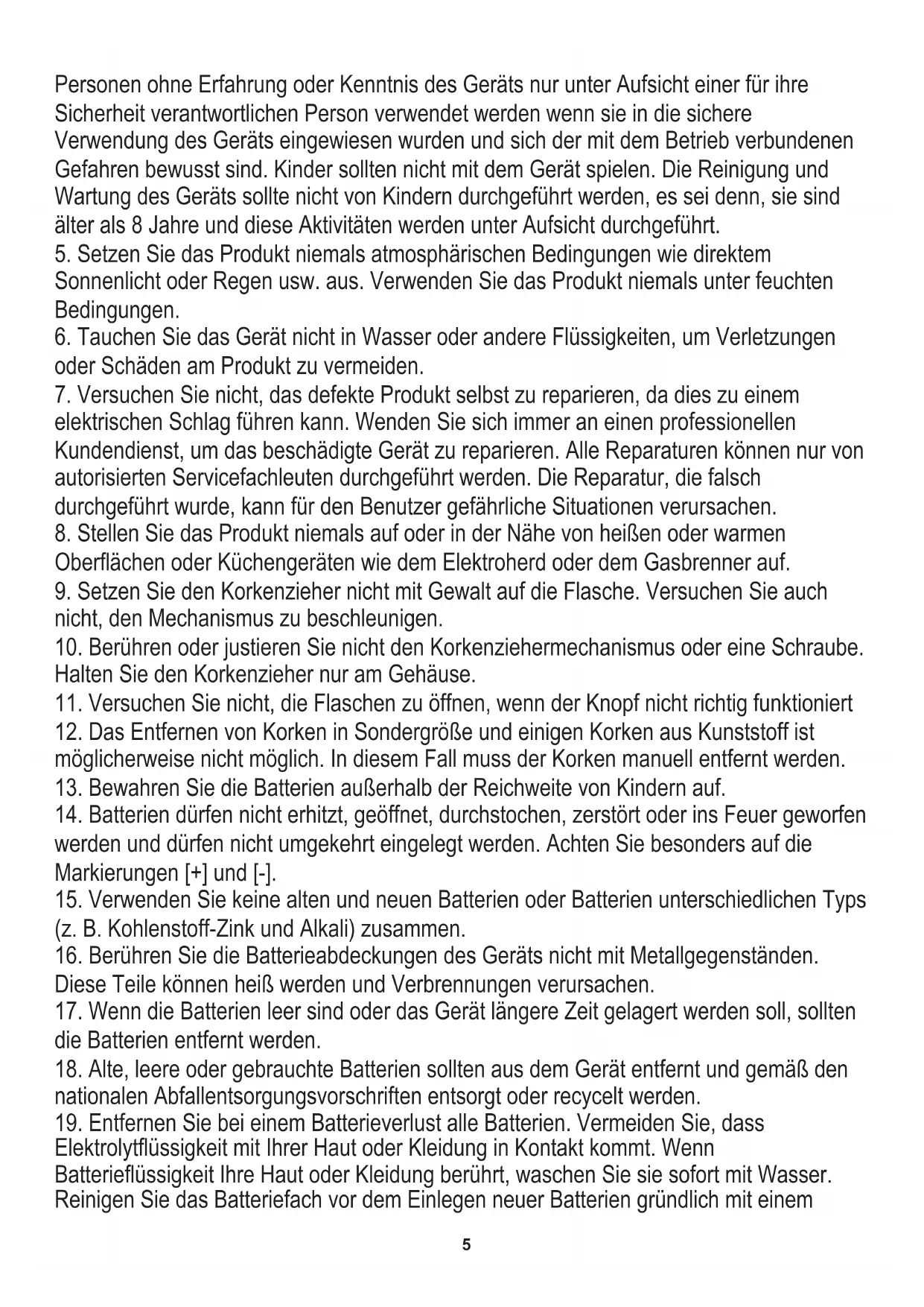 1. Entfernen Sie vor dem ersten Gebrauch des Korkenziehers die Folie auf der Flasche mit dem angebrachten Folienschneider (6). HINWEIS: Der Cutter ist sehr scharf. 2. Setzen Sie den Korkenzieher senkrecht auf die Flasche. Wenn Sie das Gehäuse festhalten und die Abwärtsbewegungstaste (2) drücken, dreht sich die Schraube in den Korken. Durch Drücken der Aufwärtsbewegungstaste (1) ziehen Sie den Korken aus der Flasche. Das Anhalten des Korkenziehermechanismus bedeutet, dass der Korken vollständig aus der Flasche gezogen wurde. HINWEIS: Wenn Sie den Korkenzieher im falschen Winkel auf eine Flasche setzen, kann der Korken möglicherweise nicht herausgeschraubt werden. 3. Um den Korken vom Korkenzieher zu entfernen, drücken Sie erneut die Abwärtstaste (2). Die Schraube (5) beginnt sich gegen den Uhrzeigersinn zu drehen, um den Korken zu lösen. REINIGEN DES GERÄTS Wenn die Korkpartikel in die Schraube gelangen, schrauben Sie die Schutzkappe (4) ab und entfernen Sie das Kunststoffrohr mit der Feder. AUSTAUSCH DER BATTERIE (Abb. 2) Entfernen Sie den Deckel des Batteriefachs auf der Rückseite des Weinöffners. Nehmen Sie gebrauchte Batterien oder Akkus heraus. Legen Sie eine neue 4x AA 1,5V Batterie ein. Achten Sie besonders auf die Polarität (+) plus und (-). Schließen Sie den Deckel des Batteriefachs. VORSICHT: Es besteht Explosionsgefahr, wenn die Batterie durch einen falschen Typ ersetzt wird. Verwenden Sie nur Batterien gleicher Größe und gleichen Typs. VORSICHT: Normale Batterien sollten nicht aufgeladen werden! TECHNISCHE DATEN Stromversorgung: Batterien 4x AA 1,5V Den Pappkarton im Altpapier entsorgen. Polyäthylenbeutel (PE) in dem Behälter für Kunststoff entsorgen. Das abgenutzte Gerät zum Recycling zu einer offiziellen Sammelstelle bringen, da es gefährliche Substanzen enthält, die die Umwelt gefährden können. Das Gerät sollte in einer Form abgegeben werden, die eine weitere Nutzung unmöglich macht. Wenn es Batterien enthält, sollten diese rausgenommen und separat an einer Sammelstelle abgegeben werden. Das Gerät darf nicht in den Hausmüll rausgeworfen werden!!