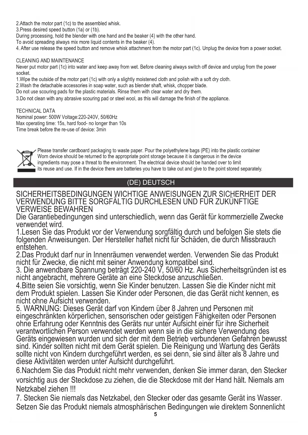 3.Drücken Sie die gewünschte Geschwindigkeitstaste (1a) oder (1b). Zeitpause vor der Wiederverwendung des Geräts: 3min 4. Lassen Sie nach dem Gebrauch die Geschwindigkeitstaste los und entfernen Sie den Schneebesenaufsatz vom Motorteil (1c). Ziehen Sie das Gerät aus der Steckdose. Verwenden Sie keine Scheuerschwämme für die Kunststoffe. Spülen Sie sie mit klarem Wasser ab und trocknen Sie się ab. Maximale Betriebszeit: 15 s, hartes Essen - nicht länger als 10 s 1.Wischen Sie die Außenseite des Motorteils (1c) nur mit einem leicht angefeuchteten Tuch ab und polieren Sie es mit einem weichen, trockenen Tuch. Motorteil (1c) niemals ins Wasser legen und vor Nässe schützen. Schalten Sie das Gerät vor der Reinigung immer aus und ziehen Sie den Netzstecker aus der Steckdose. 2.Waschen Sie das abnehmbare Zubehör in Seifenwasser, z. B. Mixerschaft, Schneebesen, Zerhackerblatt. Halten Sie während der Verarbeitung den Mixer mit einer Hand und das Becherglas (4) mit der anderen Hand fest.