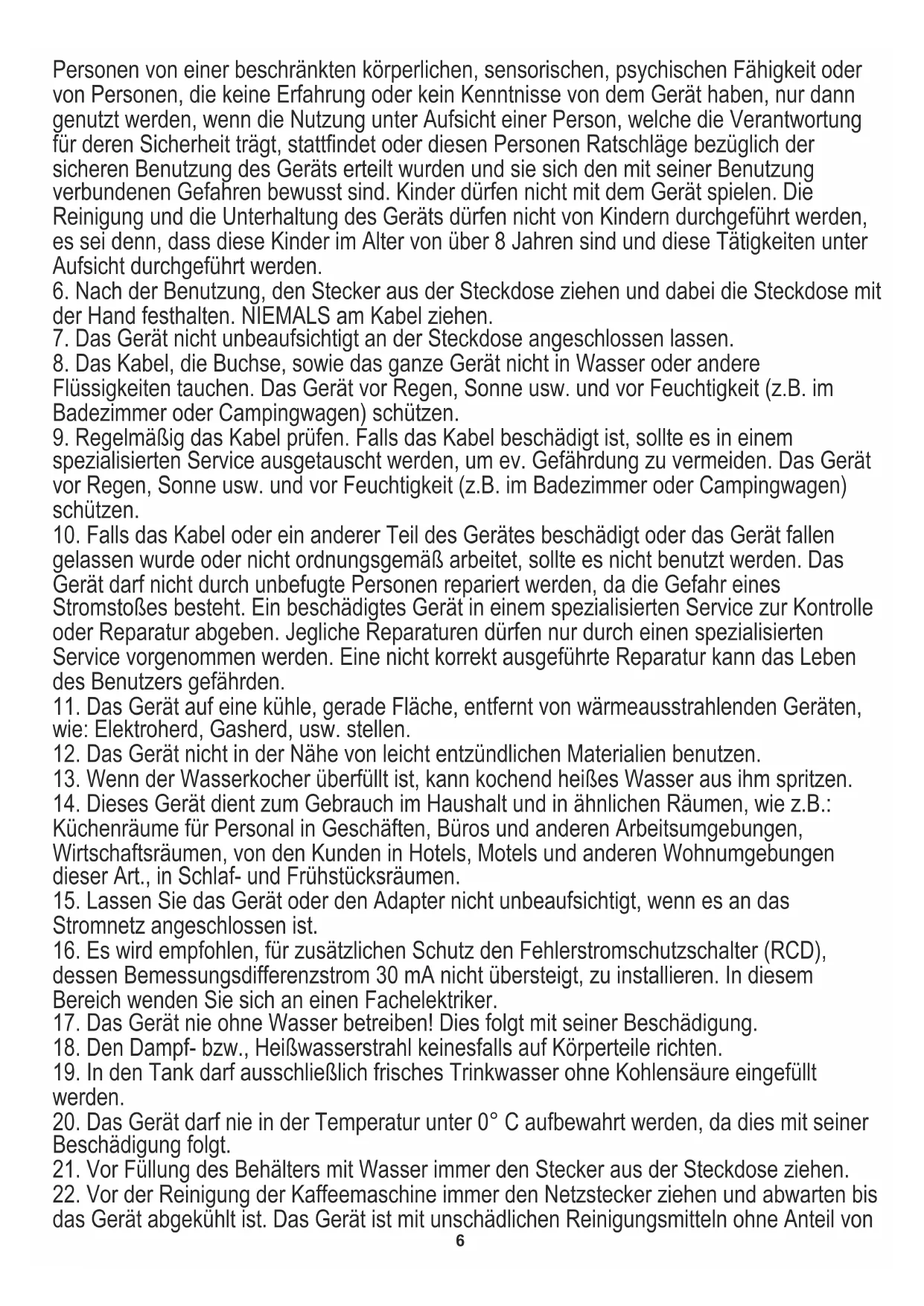 22. Vor der Reinigung der Kaffeemaschine immer den Netzstecker ziehen und abwarten bis