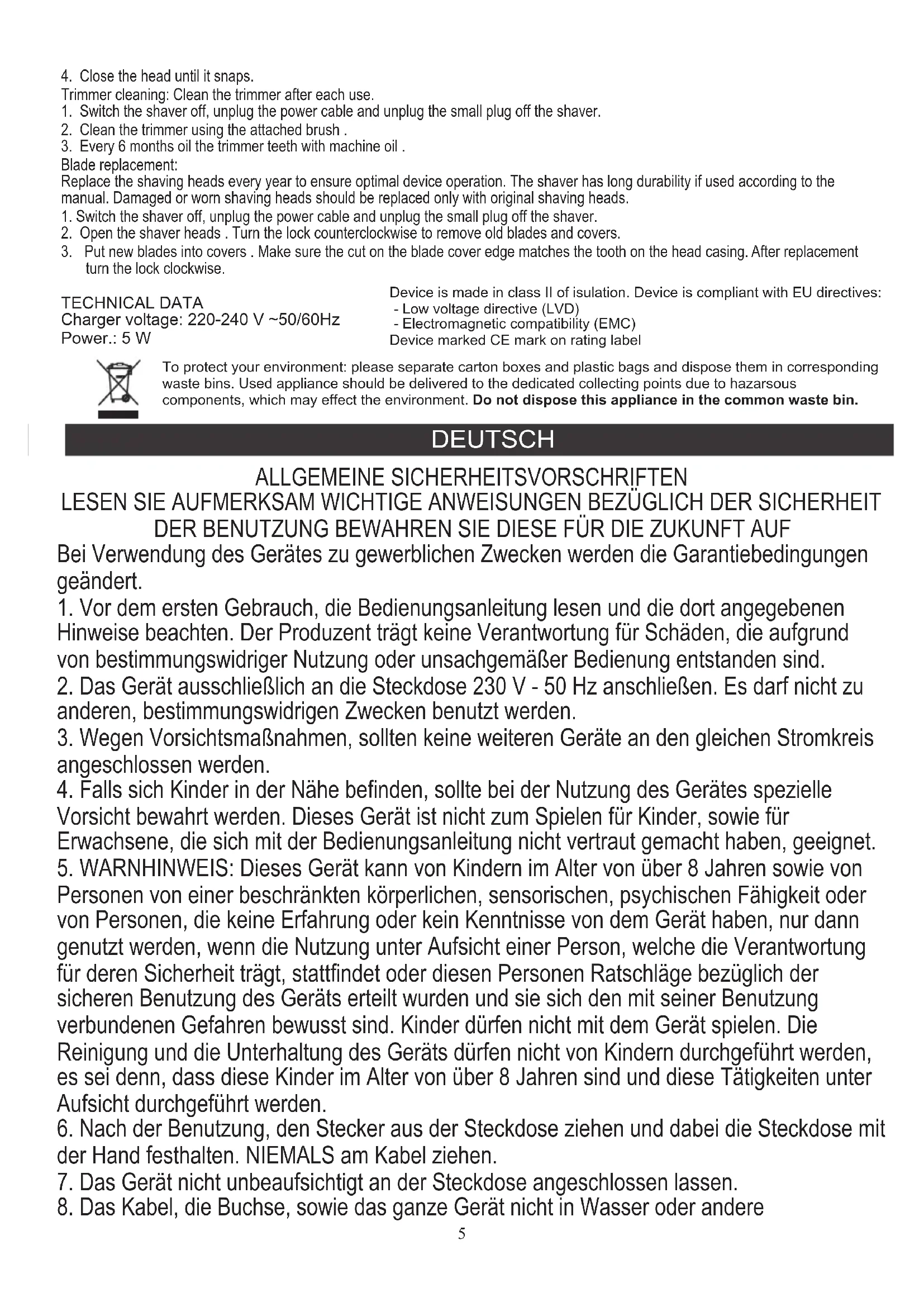2. Öffnen Sie die Scherköpfe. Drehen Sie das Schloss gegen den Uhrzeigersinn, um alte Klingen und Abdeckungen zu entfernen. 3. Setzen Sie neue Klingen in die Abdeckungen ein. Stellen Sie sicher, dass der Schnitt an der Klingenabdeckkante mit dem Zahn am Kopfgehäuse übereinstimmt. Nach dem Austausch das Schloss im Uhrzeigersinn drehen. TECHNISCHE DATEN Ladespannung: 2220-240 V ~50/60Hz Max Leistung: 3 W 3. Setzen Sie die Klingen nach der Reinigung in den Deckel ein und legen Sie das Gerät in das Gehäuse. Achten Sie dabei auf die Führungsschnitte an der Kante des Deckels. Stellen Sie sicher, dass der Schnitt an der Deckelkante mit dem Zahn am Kopfgehäuse übereinstimmt. Setzen Sie als nächstes das Sicherungselement wieder auf und drehen Sie das Schloss im Uhrzeigersinn. Die Köpfe können mit Wasser gespült werden. 2. Reinigen Sie die Klingen und Abdeckungen mit der beiliegenden Bürste. Reinigen Sie immer nur einen Messersatz und eine Abdeckung. Mischen Sie nicht die Klingen und Abdeckungen. Der effektive Betrieb jedes Satzes kann nur durch die exakte Passung der Klingen an den Abdeckungen sichergestellt werden. Reinigung der Scherköpfe (alle 6 Monate) 1. Öffnen Sie die Rasierbaugruppe, drehen Sie die Verriegelung gegen den Uhrzeigersinn, entfernen Sie das Sicherungselement und entfernen Sie die Klingen.