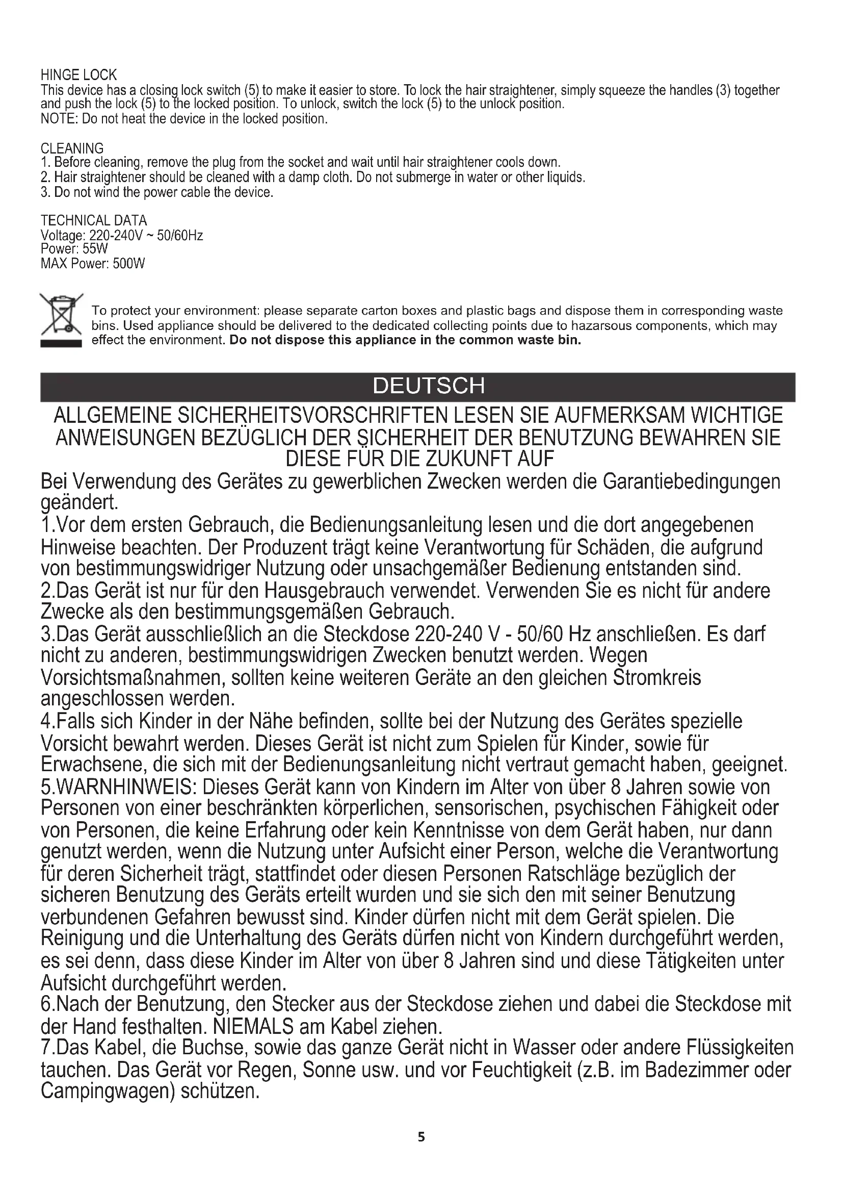 HINWEIS: Das Gerät ist während des Betriebs heiß. Berühren Sie die Kopfhaut oder die Hände nicht mit den Platten. Nach ungefähr einer Stunde schaltet sich das Gerät automatisch aus. Drücken Sie die Ein / Aus-Taste (1), um das Gerät wieder zu aktivieren. Dieses Gerät verfügt über einen Schließsperrschalter (5), um die Aufbewahrung zu erleichtern. Um den Haarglätter zu verriegeln, drücken Sie einfach die Griffe (3) zusammen und drücken Sie das Schloss (5) in die verriegelte Position. Zum Entriegeln das Schloss (5) in die Entriegelungsposition schalten. Spannung: 220-240 V ~ 50/60 Hz SCHARNIERSCHLOSS