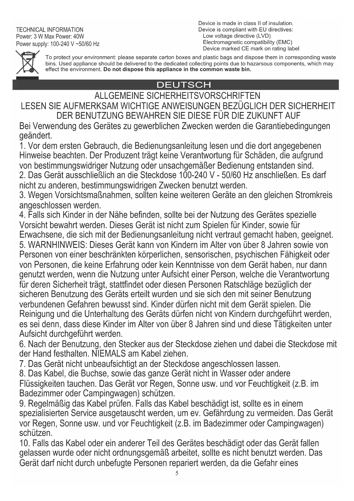 gelassen wurde oder nicht ordnungsgemäß arbeitet, sollte es nicht benutzt werden. Das Gerät darf nicht durch unbefugte Personen repariert werden, da die Gefahr eines TECHNICAL INFORMATION Power: 3 W Max Power: 40W Power supply: 100-240 V ~50/60 Hz Device is made in class II of insulation. Device is compliant with EU directives: Low voltage directive (LVD) Electromagnetic compatibility (EMC) Device marked CE mark on rating label DEUTSCH To protect your environment: please separate carton boxes and plastic bags and dispose them in corresponding waste bins. Used appliance should be delivered to the dedicated collecting points due to hazarsous components, which may effect the environment. Do not dispose this appliance in the common waste bin. 5Stromstoßes besteht. Ein beschädigtes Gerät in einem spezialisierten Service zur Kontrolle oder Reparatur abgeben. Jegliche Reparaturen dürfen nur durch einen spezialisierten Service vorgenommen werden. Eine nicht korrekt ausgeführte Reparatur kann das Leben des Benutzers gefährden. 11. Das Gerät auf eine kühle, gerade Fläche, entfernt von wärmeausstrahlenden Geräten, wie: Elektroherd, Gasherd, usw. stellen.