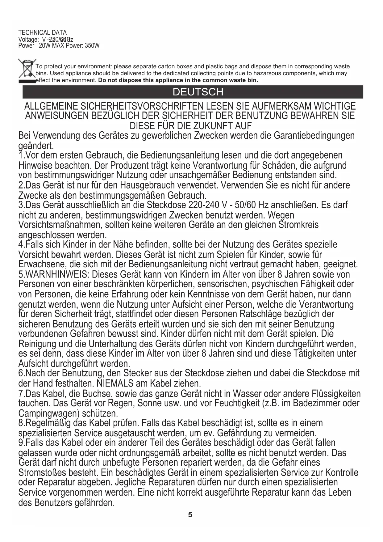 TECHNICAL DATA Voltage: V ~ 50/60Hz Power 20W MAX Power: 350W 220-24010.Das Gerät auf eine kühle, gerade Fläche, entfernt von wärmeausstrahlenden Geräten, wie: Elektroherd, Gasherd, usw. stellen. 11.Das Gerät nicht in der Nähe von leicht entzündlichen Materialien benutzen. 12.Das Kabel darf nicht außerhalb der Tischkante hängen oder heiße Flächen berühren. 13.Lassen Sie das Gerät oder den Adapter nicht unbeaufsichtigt, wenn es an das Stromnetz angeschlossen ist. 14.Es wird empfohlen, für zusätzlichen Schutz den Fehlerstromschutzschalter (RCD), dessen Bemessungsdifferenzstrom 30 mA nicht übersteigt, zu installieren. In diesem Bereich wenden Sie sich an einen Fachelektriker.