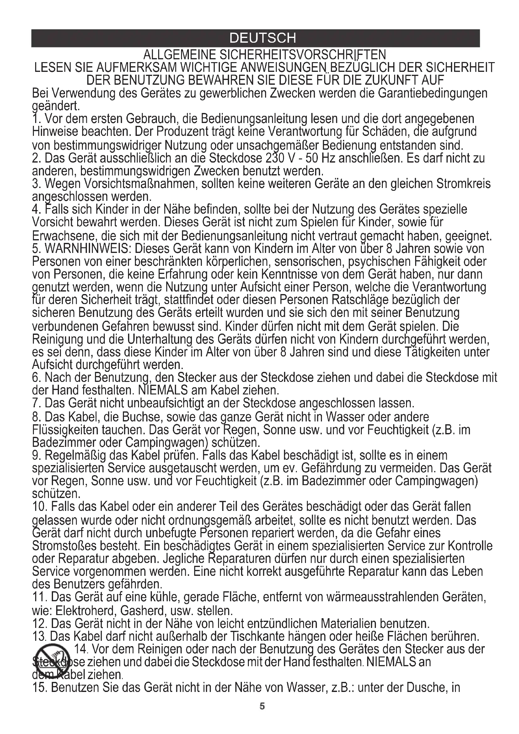 15. Benutzen Sie das Gerät nicht in der Nähe von Wasser, z.B.: unter der Dusche, in