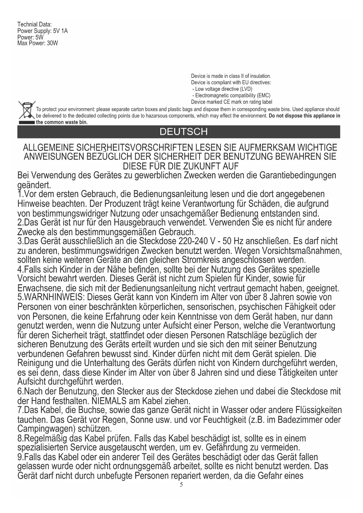 Bei Verwendung des Gerätes zu gewerblichen Zwecken werden die Garantiebedingungen geändert. 1.Vor dem ersten Gebrauch, die Bedienungsanleitung lesen und die dort angegebenen Hinweise beachten. Der Produzent trägt keine Verantwortung für Schäden, die aufgrund von bestimmungswidriger Nutzung oder unsachgemäßer Bedienung entstanden sind. 2.Das Gerät ist nur für den Hausgebrauch verwendet. Verwenden Sie es nicht für andere Zwecke als den bestimmungsgemäßen Gebrauch. 3.Das Gerät ausschließlich an die Steckdose 220-240 V - 50 Hz anschließen. Es darf nicht zu anderen, bestimmungswidrigen Zwecken benutzt werden. Wegen Vorsichtsmaßnahmen, sollten keine weiteren Geräte an den gleichen Stromkreis angeschlossen werden. 4.Falls sich Kinder in der Nähe befinden, sollte bei der Nutzung des Gerätes spezielle Vorsicht bewahrt werden. Dieses Gerät ist nicht zum Spielen für Kinder, sowie für Erwachsene, die sich mit der Bedienungsanleitung nicht vertraut gemacht haben, geeignet. 5.WARNHINWEIS: Dieses Gerät kann von Kindern im Alter von über 8 Jahren sowie von Personen von einer beschränkten körperlichen, sensorischen, psychischen Fähigkeit oder von Personen, die keine Erfahrung oder kein Kenntnisse von dem Gerät haben, nur dann genutzt werden, wenn die Nutzung unter Aufsicht einer Person, welche die Verantwortung für deren Sicherheit trägt, stattfindet oder diesen Personen Ratschläge bezüglich der sicheren Benutzung des Geräts erteilt wurden und sie sich den mit seiner Benutzung verbundenen Gefahren bewusst sind. Kinder dürfen nicht mit dem Gerät spielen. Die Reinigung und die Unterhaltung des Geräts dürfen nicht von Kindern durchgeführt werden, es sei denn, dass diese Kinder im Alter von über 8 Jahren sind und diese Tätigkeiten unter Aufsicht durchgeführt werden. 6.Nach der Benutzung, den Stecker aus der Steckdose ziehen und dabei die Steckdose mit der Hand festhalten. NIEMALS am Kabel ziehen. 7.Das Kabel, die Buchse, sowie das ganze Gerät nicht in Wasser oder andere Flüssigkeiten tauchen. Das Gerät vor Regen, Sonne usw. und vor Feuchtigkeit (z.B. im Badezimmer oder Campingwagen) schützen. 8.Regelmäßig das Kabel prüfen. Falls das Kabel beschädigt ist, sollte es in einem spezialisierten Service ausgetauscht werden, um ev. Gefährdung zu vermeiden. 9.Falls das Kabel oder ein anderer Teil des Gerätes beschädigt oder das Gerät fallen gelassen wurde oder nicht ordnungsgemäß arbeitet, sollte es nicht benutzt werden. Das Gerät darf nicht durch unbefugte Personen repariert werden, da die Gefahr eines DEUTSCH Technial Data: Power Supply: 5V 1A Power: 5W Max Power: 30W DEUTSCH To protect your environment: please separate carton boxes and plastic bags and dispose them in corresponding waste bins. Used appliance should be delivered to the dedicated collecting points due to hazarsous components, which may effect the environment. Do not dispose this appliance in the common waste bin. Device is made in class II of insulation. Device is compliant with EU directives: - Low voltage directive (LVD) - Electromagnetic compatibility (EMC) Device marked CE mark on rating label 5Stromstoßes besteht. Ein beschädigtes Gerät in einem spezialisierten Service zur Kontrolle oder Reparatur abgeben. Jegliche Reparaturen dürfen nur durch einen spezialisierten Service vorgenommen werden. Eine nicht korrekt ausgeführte Reparatur kann das Leben des Benutzers gefährden. 10.Das Gerät auf eine kühle, gerade Fläche, entfernt von wärmeausstrahlenden Geräten, wie: Elektroherd, Gasherd, usw. stellen. 11.Das Gerät nicht in der Nähe von leicht entzündlichen Materialien benutzen. 12.Das Kabel darf nicht außerhalb der Tischkante hängen oder heiße Flächen berühren. 13.Lassen Sie das Gerät oder den Adapter nicht unbeaufsichtigt, wenn es an das Stromnetz angeschlossen ist. 14.Es wird empfohlen, für zusätzlichen Schutz den Fehlerstromschutzschalter (RCD), dessen Bemessungsdifferenzstrom 30 mA nicht übersteigt, zu installieren. In diesem Bereich wenden Sie sich an einen Fachelektriker. Das Gerät ist nicht zum Betrieb mit den externen Zeitschaltern oder zur getrennten Fernbedienung bestimmt.