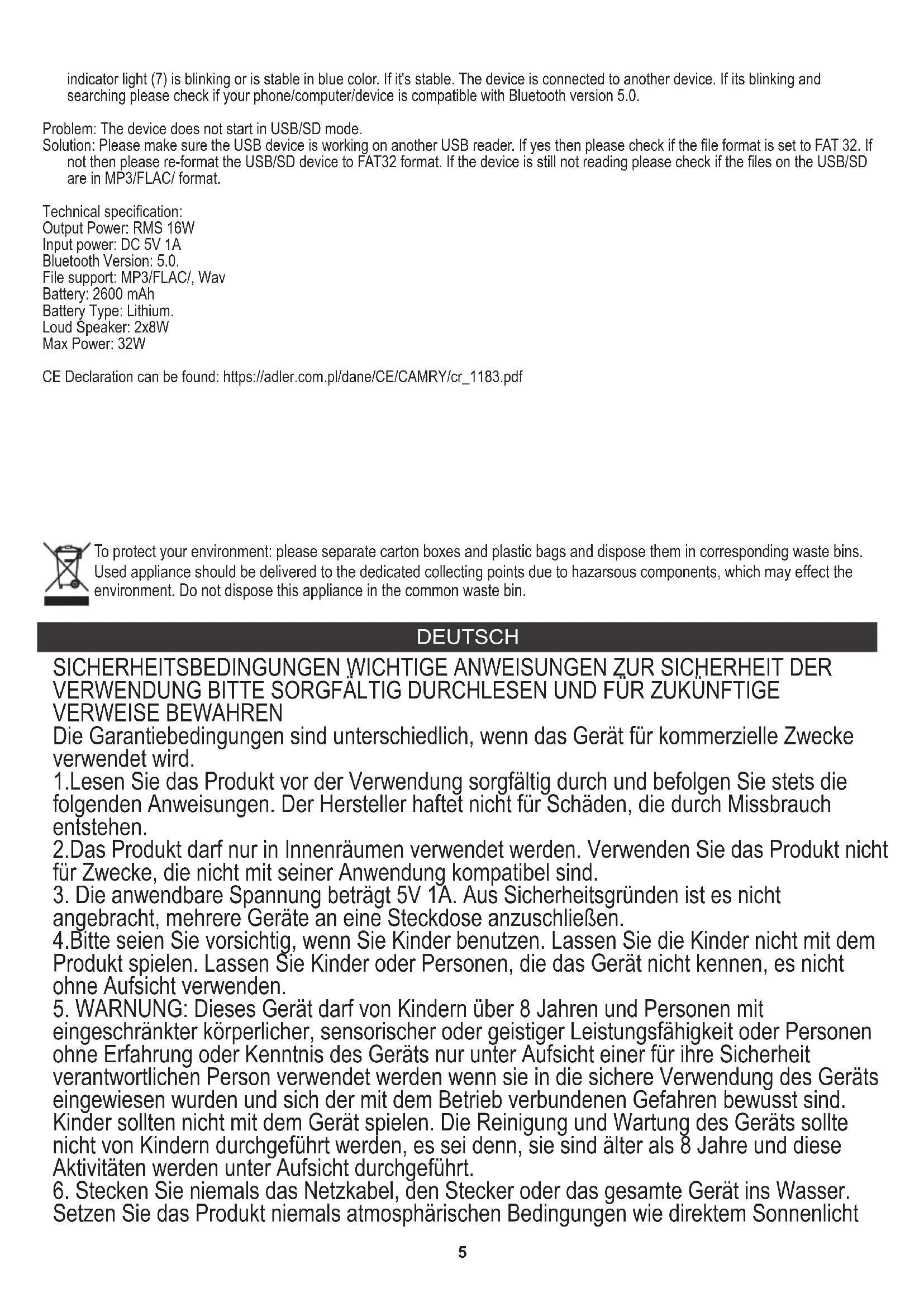 5. WARNUNG: Dieses Gerät darf von Kindern über 8 Jahren und Personen mit