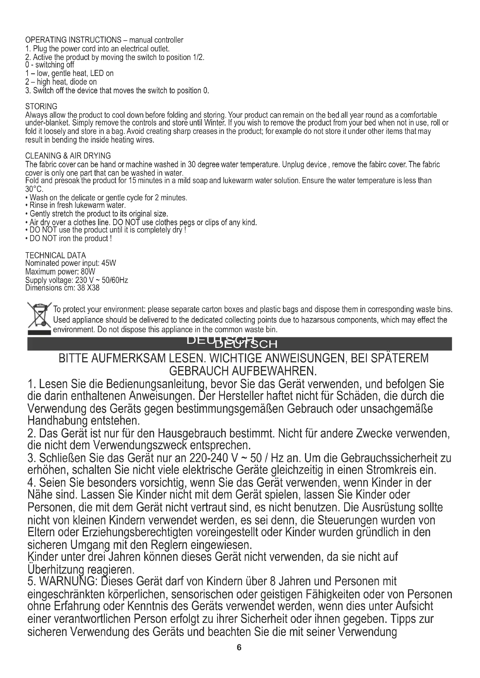 - Das Produkt NICHT bügeln! TECHNISCHE DATEN Nennleistung: 45W Maximale Leistung: 80W Versorgungsspannung: 230 V ~ 50 / 60Hz Abmessungen cm: 38 x 38 Den Pappkarton im Altpapier entsorgen. Polyäthylenbeutel (PE) in dem Behälter für Kunststoff entsorgen. Das abgenutzte Gerät zum Recycling zu einer offiziellen Sammelstelle bringen, da es gefährliche Substanzen enthält, die die Umwelt gefährden können. Das Gerät sollte in einer Form abgegeben werden, die eine weitere Nutzung unmöglich macht. Wenn es Batterien enthält, sollten diese rausgenommen und separat an einer Sammelstelle abgegeben werden. Das Gerät darf nicht in den Hausmüll rausgeworfen werden!! FRANÇAIS LISEZ ATTENTIVEMENT S'IL VOUS PLAÎT. INSTRUCTIONS IMPORTANTES, CONSERVER POUR UNE UTILISATION ULTÉRIEURE.