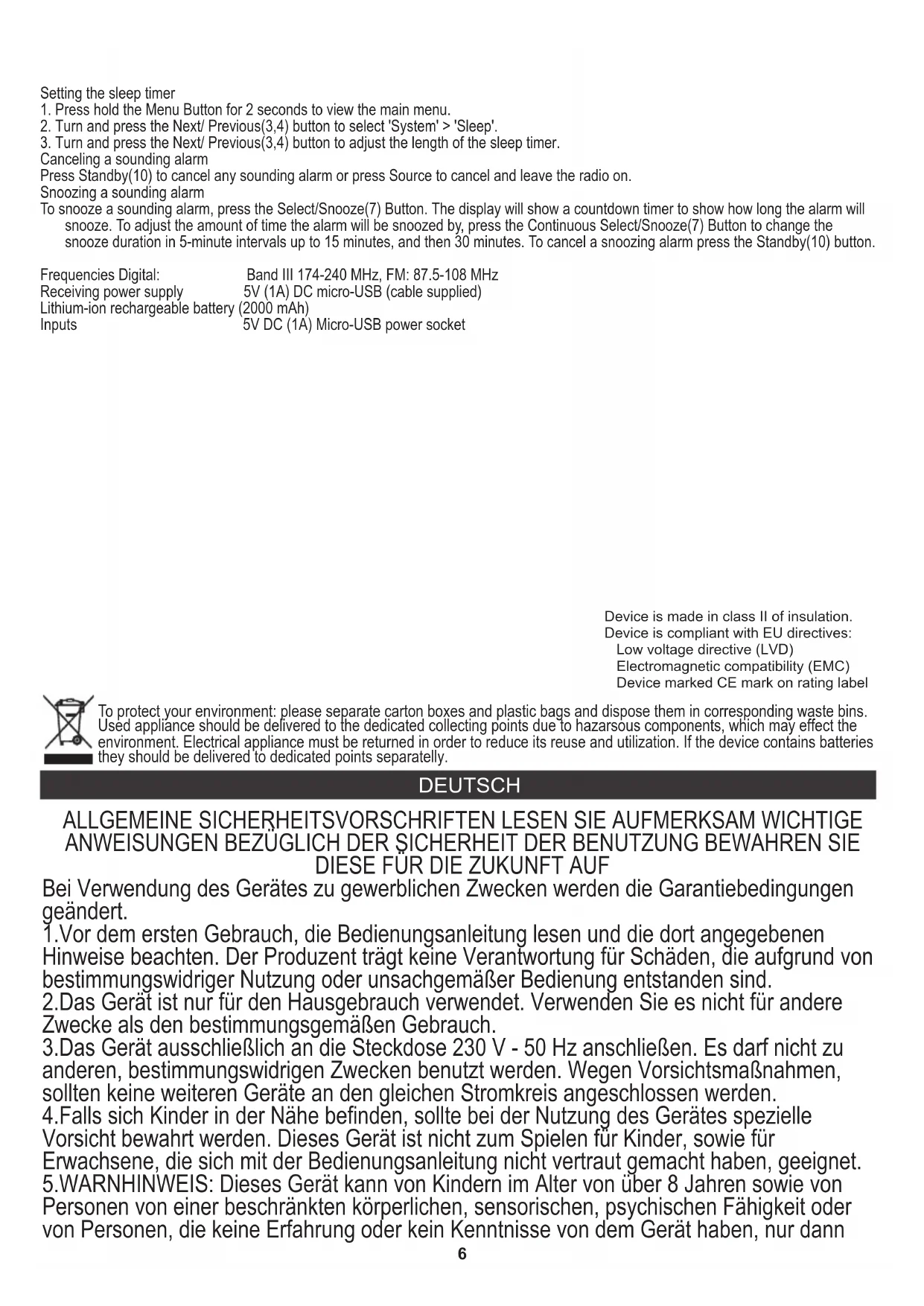 Canceling a sounding alarm Press Standby(10) to cancel any sounding alarm or press Source to cancel and leave the radio on. Snoozing a sounding alarm To snooze a sounding alarm, press the Select/Snooze(7) Button. The display will show a countdown timer to show how long the alarm will snooze. To adjust the amount of time the alarm will be snoozed by, press the Continuous Select/Snooze(7) Button to change the snooze duration in 5-minute intervals up to 15 minutes, and then 30 minutes. To cancel a snoozing alarm press the Standby(10) button. Frequencies Digital: Band III 174-240 MHz, FM: 87.5-108 MHz Receiving power supply 5V (1A) DC micro-USB (cable supplied) Lithium-ion rechargeable battery (2000 mAh) Inputs 5V DC (1A) Micro-USB power socket To protect your environment: please separate carton boxes and plastic bags and dispose them in corresponding waste bins. Used appliance should be delivered to the dedicated collecting points due to hazarsous components, which may effect the environment. Electrical appliance must be returned in order to reduce its reuse and utilization. If the device contains batteries they should be delivered to dedicated points separatelly. DEUTSCH Device is made in class II of insulation. Device is compliant with EU directives: Low voltage directive (LVD) Electromagnetic compatibility (EMC) Device marked CE mark on rating label7 genutzt werden, wenn die Nutzung unter Aufsicht einer Person, welche die Verantwortung für deren Sicherheit trägt, stattfindet oder diesen Personen Ratschläge bezüglich der sicheren Benutzung des Geräts erteilt wurden und sie sich den mit seiner Benutzung verbundenen Gefahren bewusst sind. Kinder dürfen nicht mit dem Gerät spielen. Die Reinigung und die Unterhaltung des Geräts dürfen nicht von Kindern durchgeführt werden, es sei denn, dass diese Kinder im Alter von über 8 Jahren sind und diese Tätigkeiten unter Aufsicht durchgeführt werden. 6.Nach der Benutzung, den Stecker aus der Steckdose ziehen und dabei die Steckdose mit der Hand festhalten. NIEMALS am Kabel ziehen. 7.Das Kabel, die Buchse, sowie das ganze Gerät nicht in Wasser oder andere Flüssigkeiten tauchen. Das Gerät vor Regen, Sonne usw. und vor Feuchtigkeit (z.B. im Badezimmer oder Campingwagen) schützen. 8.Regelmäßig das Kabel prüfen. Falls das Kabel beschädigt ist, sollte es in einem spezialisierten Service ausgetauscht werden, um ev. Gefährdung zu vermeiden. 9.Falls das Kabel oder ein anderer Teil des Gerätes beschädigt oder das Gerät fallen gelassen wurde oder nicht ordnungsgemäß arbeitet, sollte es nicht benutzt werden. Das Gerät darf nicht durch unbefugte Personen repariert werden, da die Gefahr eines Stromstoßes besteht. Ein beschädigtes Gerät in einem spezialisierten Service zur Kontrolle oder Reparatur abgeben. Jegliche Reparaturen dürfen nur durch einen spezialisierten Service vorgenommen werden. Eine nicht korrekt ausgeführte Reparatur kann das Leben des Benutzers gefährden. 10.Das Gerät auf eine kühle, gerade Fläche, entfernt von wärmeausstrahlenden Geräten, wie: Elektroherd, Gasherd, usw. stellen. 11.Das Gerät nicht in der Nähe von leicht entzündlichen Materialien benutzen. 12.Das Kabel darf nicht außerhalb der Tischkante hängen oder heiße Flächen berühren. 13.Lassen Sie das Gerät oder den Adapter nicht unbeaufsichtigt, wenn es an das Stromnetz angeschlossen ist. 14.Es wird empfohlen, für zusätzlichen Schutz den Fehlerstromschutzschalter (RCD), dessen Bemessungsdifferenzstrom 30 mA nicht übersteigt, zu installieren. In diesem Bereich wenden Sie sich an einen Fachelektriker.