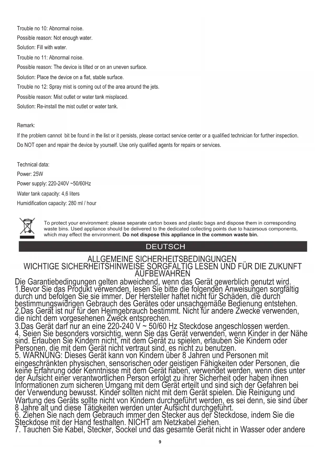 Trouble no 10: Abnormal noise. Possible reason: Not enough water. Solution: Fill with water. Trouble no 11: Abnormal noise. Possible reason: The device is tilted or on an uneven surface. Solution: Place the device on a flat, stable surface. Trouble no 12: Spray mist is coming out of the area around the jets. Possible reason: Mist outlet or water tank misplaced. Solution: Re-install the mist outlet or water tank. Remark: If the problem cannot bit be found in the list or it persists, please contact service center or a qualified technician for further inspection. Do NOT open and repair the device by yourself. Use only qualified agents for repairs or services. Technical data: Power: 25W Power supply: 220-240V ~50/60Hz Water tank capacity: 4,6 liters Humidification capacity: 280 ml / hour10 Flüssigkeiten. Setzen Sie das Gerät nicht atmosphärischen Bedingungen (Regen, Sonne usw.) aus oder verwenden Sie es nicht bei hoher Luftfeuchtigkeit (Badezimmer, feuchte Wohnmobile).