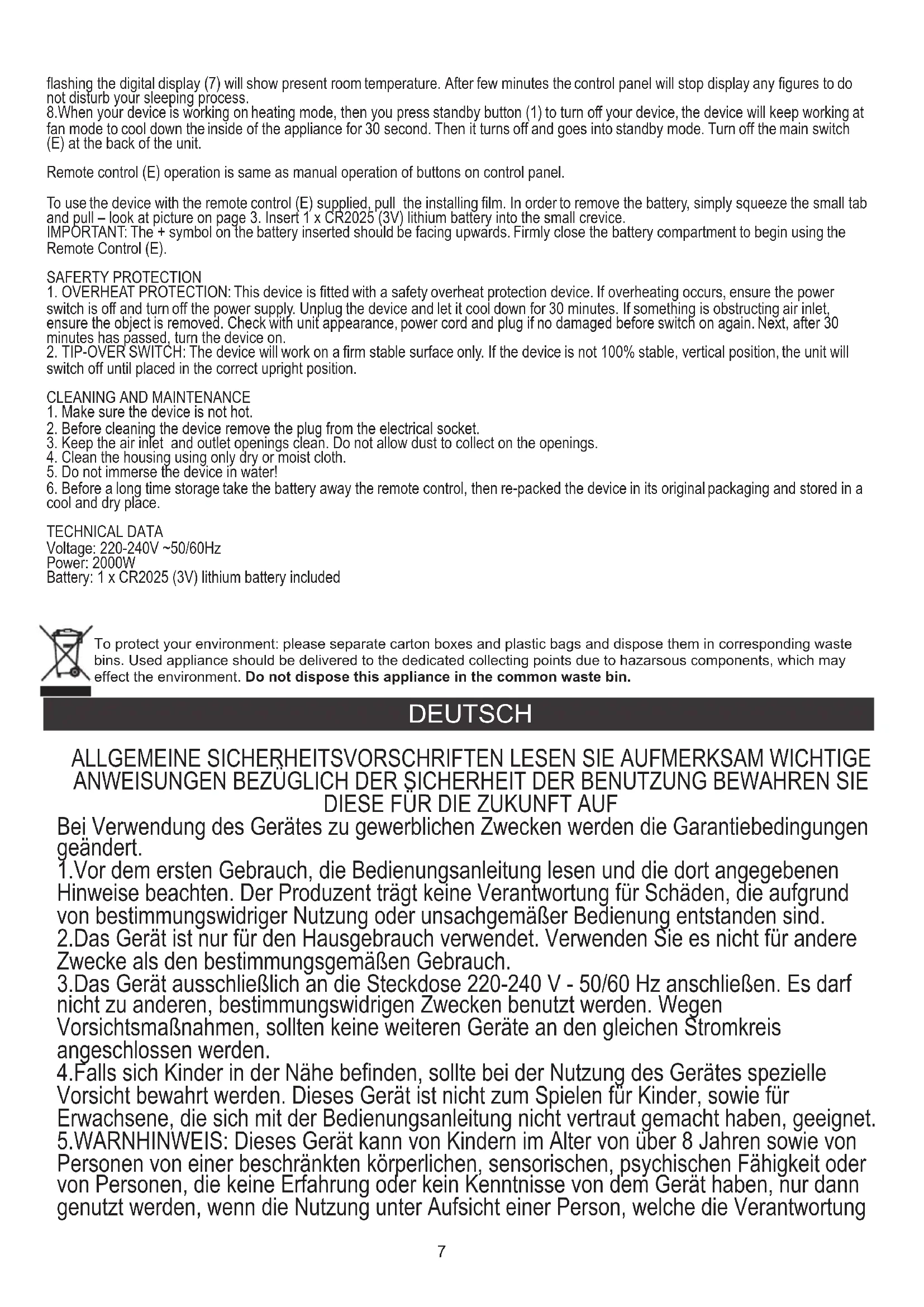 Bei Verwendung des Gerätes zu gewerblichen Zwecken werden die Garantiebedingungen geändert. 1.Vor dem ersten Gebrauch, die Bedienungsanleitung lesen und die dort angegebenen Hinweise beachten. Der Produzent trägt keine Verantwortung für Schäden, die aufgrund von bestimmungswidriger Nutzung oder unsachgemäßer Bedienung entstanden sind. 2.Das Gerät ist nur für den Hausgebrauch verwendet. Verwenden Sie es nicht für andere Zwecke als den bestimmungsgemäßen Gebrauch. 3.Das Gerät ausschließlich an die Steckdose 220-240 V - 50/60 Hz anschließen. Es darf nicht zu anderen, bestimmungswidrigen Zwecken benutzt werden. Wegen Vorsichtsmaßnahmen, sollten keine weiteren Geräte an den gleichen Stromkreis angeschlossen werden. 4.Falls sich Kinder in der Nähe befinden, sollte bei der Nutzung des Gerätes spezielle Vorsicht bewahrt werden. Dieses Gerät ist nicht zum Spielen für Kinder, sowie für Erwachsene, die sich mit der Bedienungsanleitung nicht vertraut gemacht haben, geeignet. 5.WARNHINWEIS: Dieses Gerät kann von Kindern im Alter von über 8 Jahren sowie von Personen von einer beschränkten körperlichen, sensorischen, psychischen Fähigkeit oder von Personen, die keine Erfahrung oder kein Kenntnisse von dem Gerät haben, nur dann genutzt werden, wenn die Nutzung unter Aufsicht einer Person, welche die Verantwortung To protect your environment: please separate carton boxes and plastic bags and dispose them in corresponding waste bins. Used appliance should be delivered to the dedicated collecting points due to hazarsous components, which may effect the environment. Do not dispose this appliance in the common waste bin. DEUTSCH flashing the digital display (7) will show present room temperature. After few minutes the control panel will stop display any figures to do not disturb your sleeping process. 8.When your device is working on heating mode, then you press standby button (1) to turn off your device, the device will keep working at fan mode to cool down the inside of the appliance for 30 second. Then it turns off and goes into standby mode. Turn off the main switch (E) at the back of the unit. Remote control (E) operation is same as manual operation of buttons on control panel. To use the device with the remote control (E) supplied, pull the installing film. In order to remove the battery, simply squeeze the small tab and pull – look at picture on page 3. Insert 1 x CR2025 (3V) lithium battery into the small crevice. IMPORTANT: The + symbol on the battery inserted should be facing upwards. Firmly close the battery compartment to begin using the Remote Control (E). SAFERTY PROTECTION 1. OVERHEAT PROTECTION: This device is fitted with a safety overheat protection device. If overheating occurs, ensure the power switch is off and turn off the power supply. Unplug the device and let it cool down for 30 minutes. If something is obstructing air inlet, ensure the object is removed. Check with unit appearance, power cord and plug if no damaged before switch on again. Next, after 30 minutes has passed, turn the device on. 2. TIP-OVER SWITCH: The device will work on a firm stable surface only. If the device is not 100% stable, vertical position, the unit will switch off until placed in the correct upright position.