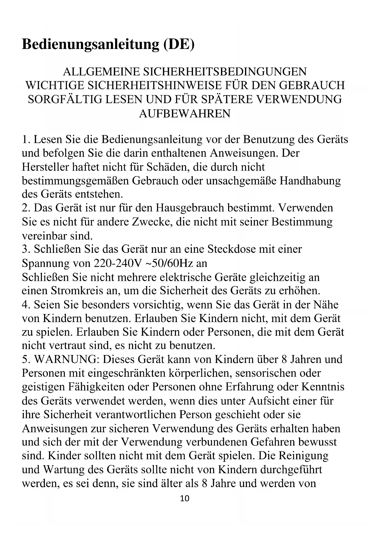 5. WARNUNG: Dieses Gerät kann von Kindern über 8 Jahren und