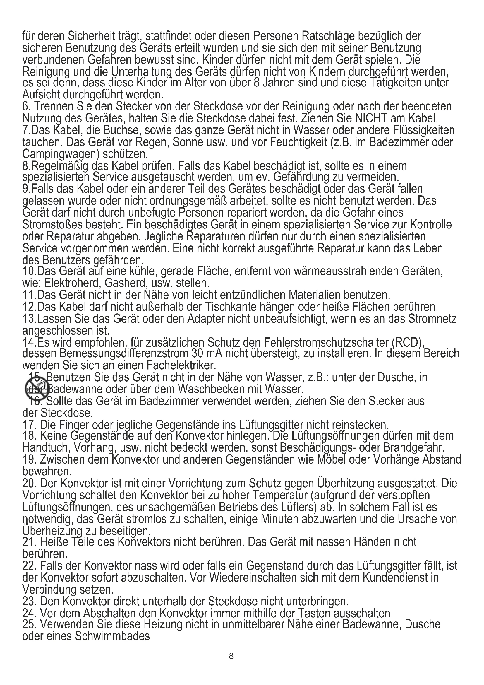 25. Verwenden Sie diese Heizung nicht in unmittelbarer Nähe einer Badewanne, Dusche