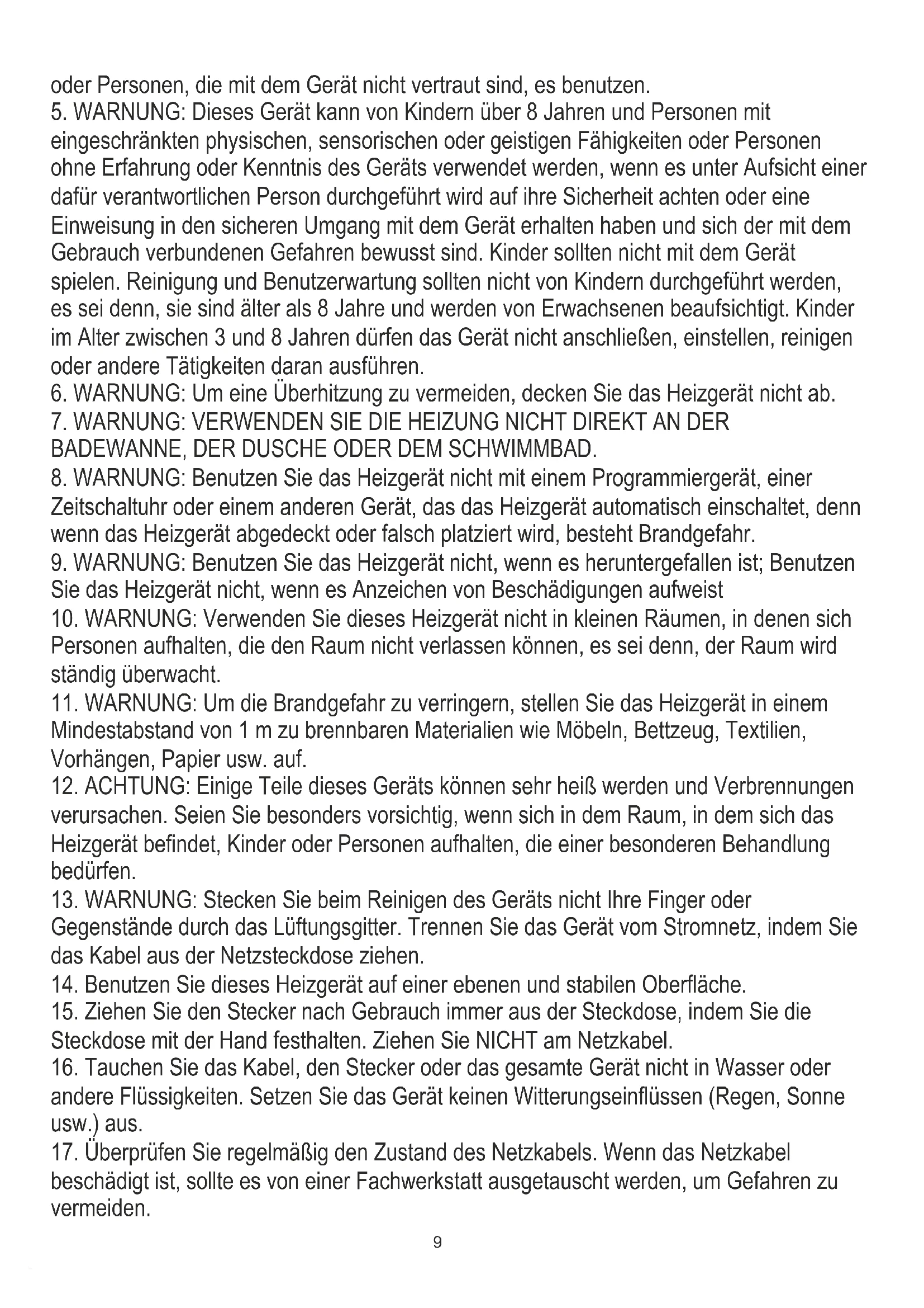 9. WARNUNG: Benutzen Sie das Heizgerät nicht, wenn es heruntergefallen ist; Benutzen