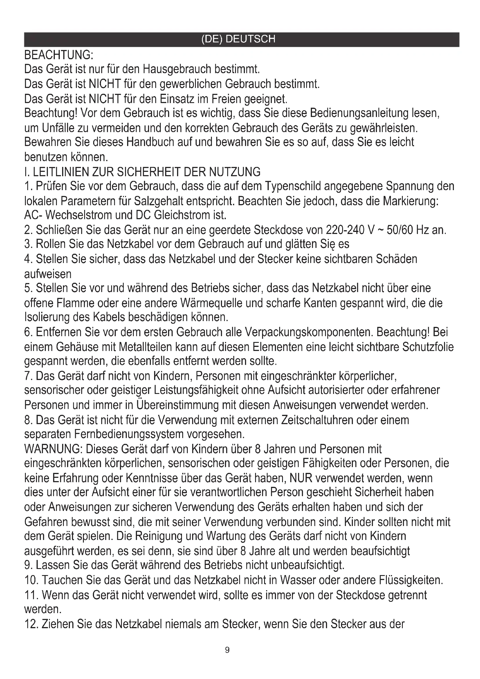water tanks.9 (DE) DEUTSCH BEACHTUNG: Das Gerät ist nur für den Hausgebrauch bestimmt. Das Gerät ist NICHT für den gewerblichen Gebrauch bestimmt. Das Gerät ist NICHT für den Einsatz im Freien geeignet. Beachtung! Vor dem Gebrauch ist es wichtig, dass Sie diese Bedienungsanleitung lesen, um Unfälle zu vermeiden und den korrekten Gebrauch des Geräts zu gewährleisten. Bewahren Sie dieses Handbuch auf und bewahren Sie es so auf, dass Sie es leicht benutzen können.