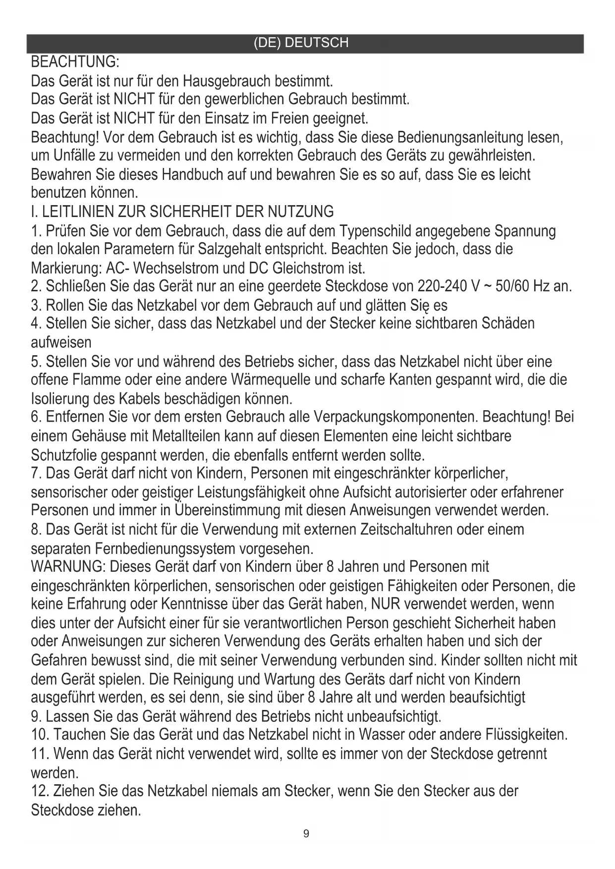 water tanks.9 BEACHTUNG: Das Gerät ist nur für den Hausgebrauch bestimmt. Das Gerät ist NICHT für den gewerblichen Gebrauch bestimmt. Das Gerät ist NICHT für den Einsatz im Freien geeignet. Beachtung! Vor dem Gebrauch ist es wichtig, dass Sie diese Bedienungsanleitung lesen, um Unfälle zu vermeiden und den korrekten Gebrauch des Geräts zu gewährleisten. Bewahren Sie dieses Handbuch auf und bewahren Sie es so auf, dass Sie es leicht benutzen können.