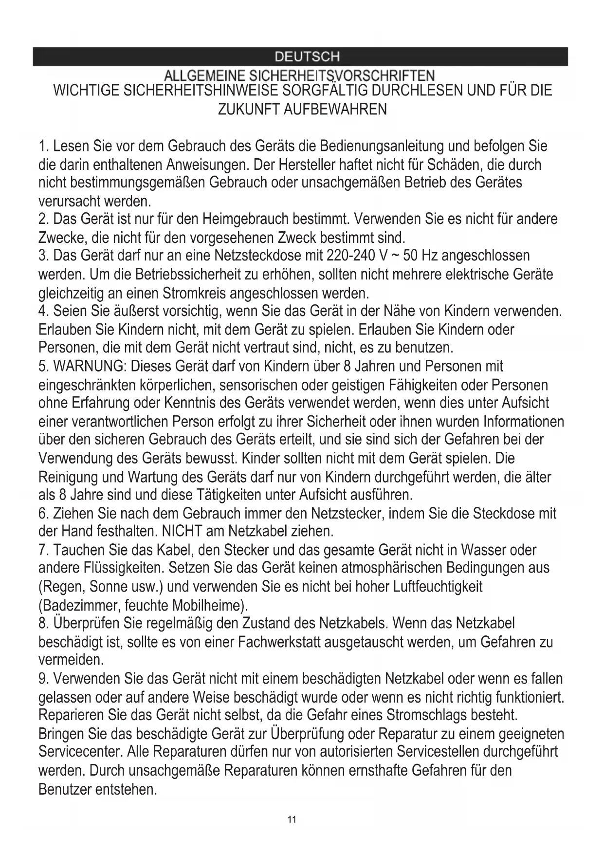 3. Das Gerät darf nur an eine Netzsteckdose mit 220-240 V ~ 50 Hz angeschlossen
