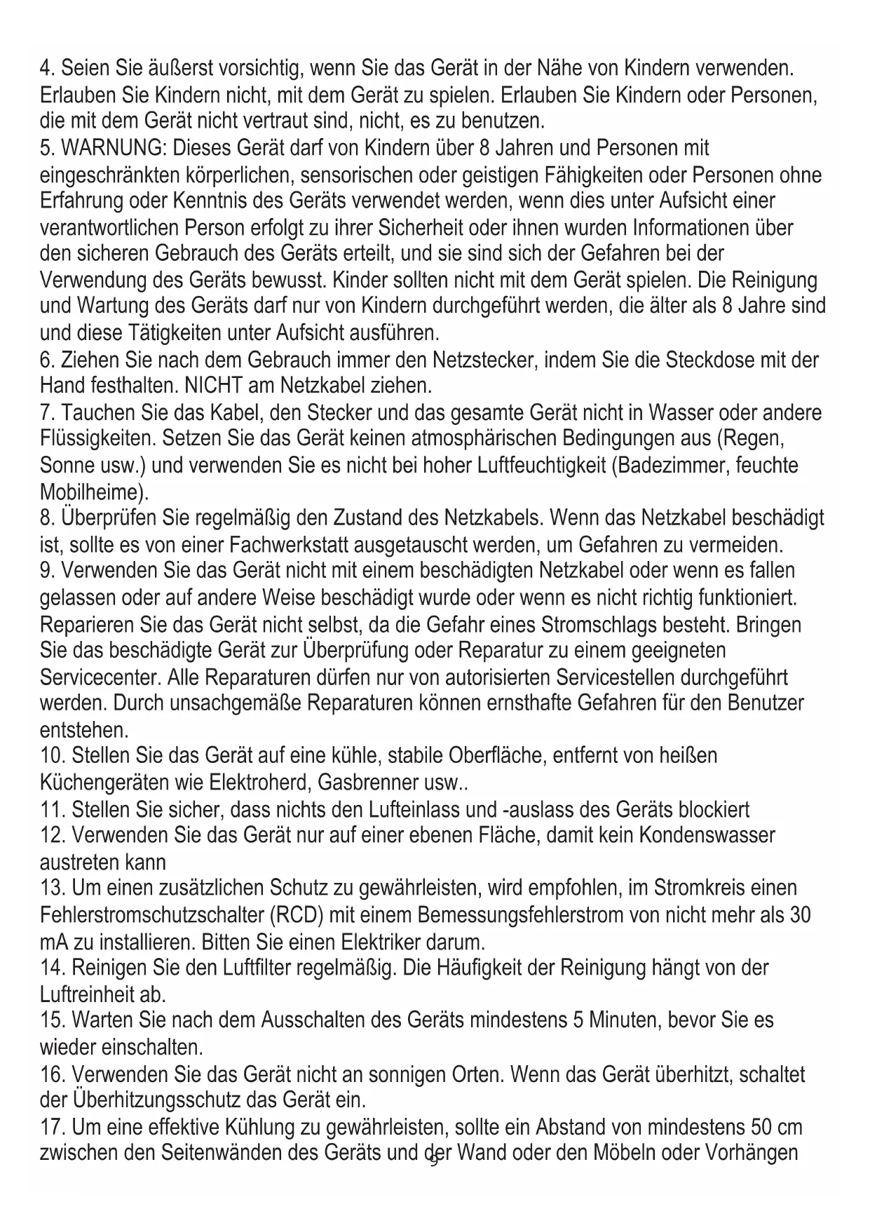 eingeschränkten körperlichen, sensorischen oder geistigen Fähigkeiten oder Personen ohne Erfahrung oder Kenntnis des Geräts verwendet werden, wenn dies unter Aufsicht einer verantwortlichen Person erfolgt zu ihrer Sicherheit oder ihnen wurden Informationen über den sicheren Gebrauch des Geräts erteilt, und sie sind sich der Gefahren bei der Verwendung des Geräts bewusst. Kinder sollten nicht mit dem Gerät spielen. Die Reinigung und Wartung des Geräts darf nur von Kindern durchgeführt werden, die älter als 8 Jahre sind und diese Tätigkeiten unter Aufsicht ausführen.
