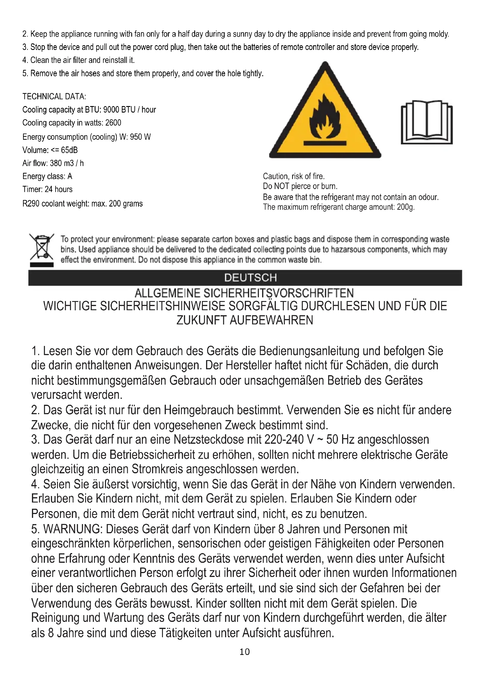 TECHNISCHE DATEN: Kühlleistung bei BTU: 9000 BTU / Stunde Kühlleistung in Watt: 2600 Energieverbrauch (Kühlung) W: 950 W Lautstärke: <= 65 dB Luftdurchsatz: 380 m3 / h Energieklasse: A Timer: 24 Stunden R290 Kühlmittelgewicht: max. 200 Gramm Den Pappkarton im Altpapier entsorgen. Polyäthylenbeutel (PE) in dem Behälter für Kunststoff entsorgen. Das abgenutzte Gerät zum Recycling zu einer offiziellen Sammelstelle bringen, da es gefährliche Substanzen enthält, die die Umwelt gefährden können. Das Gerät sollte in einer Form abgegeben werden, die eine weitere Nutzung unmöglich macht. Wenn es Batterien enthält, sollten diese rausgenommen und separat an einer Sammelstelle abgegeben werden. Das Gerät darf nicht in den Hausmüll rausgeworfen werden!!