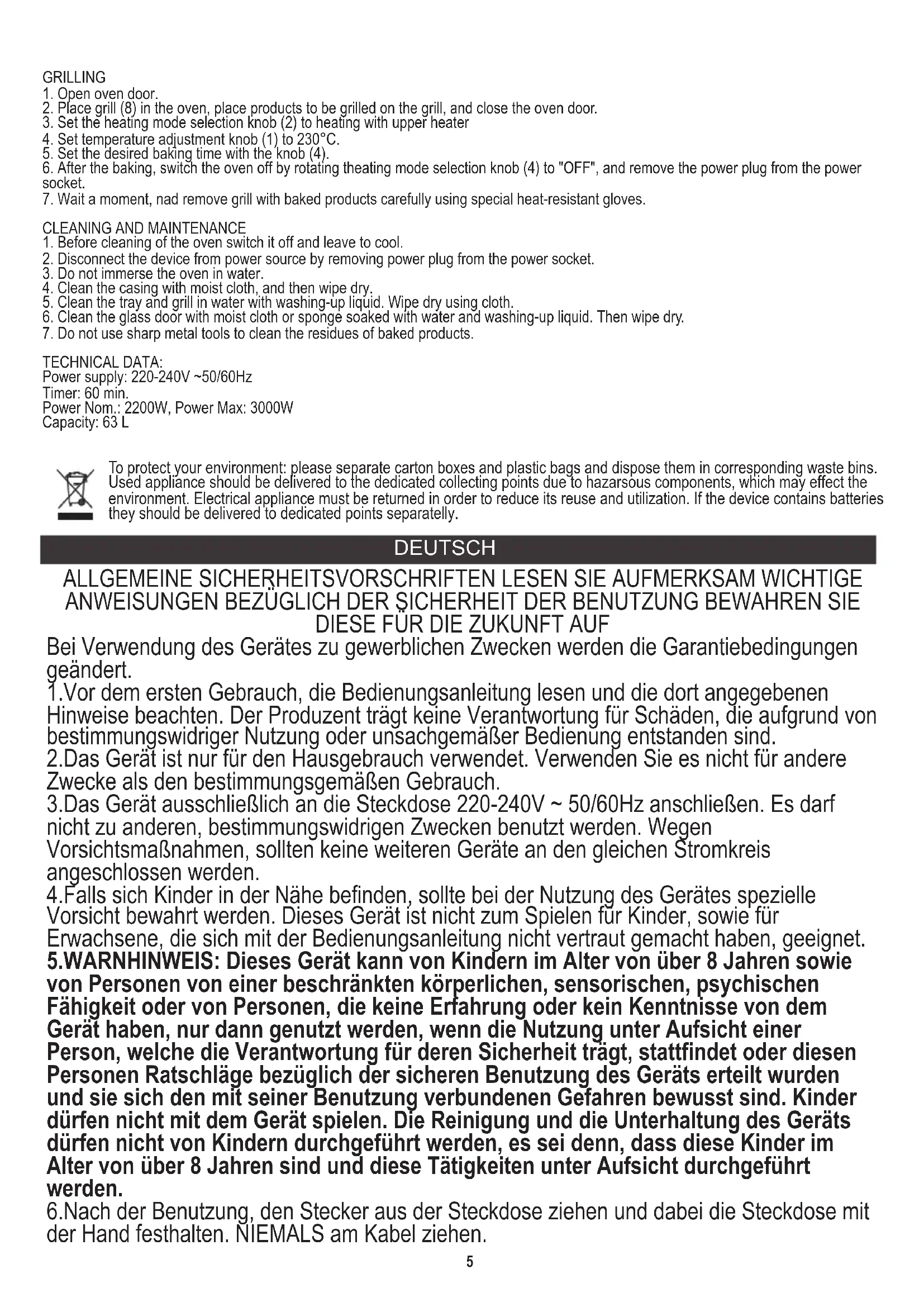 TECHNICAL DATA: Power supply: 220-240V ~50/60Hz Capacity: 63 L Power Nom.: 2200W, Power Max: 3000W 1.Vor dem ersten Gebrauch, die Bedienungsanleitung lesen und die dort angegebenen Hinweise beachten. Der Produzent trägt keine Verantwortung für Schäden, die aufgrund von bestimmungswidriger Nutzung oder unsachgemäßer Bedienung entstanden sind. 4.Falls sich Kinder in der Nähe befinden, sollte bei der Nutzung des Gerätes spezielle Vorsicht bewahrt werden. Dieses Gerät ist nicht zum Spielen für Kinder, sowie für Erwachsene, die sich mit der Bedienungsanleitung nicht vertraut gemacht haben, geeignet.