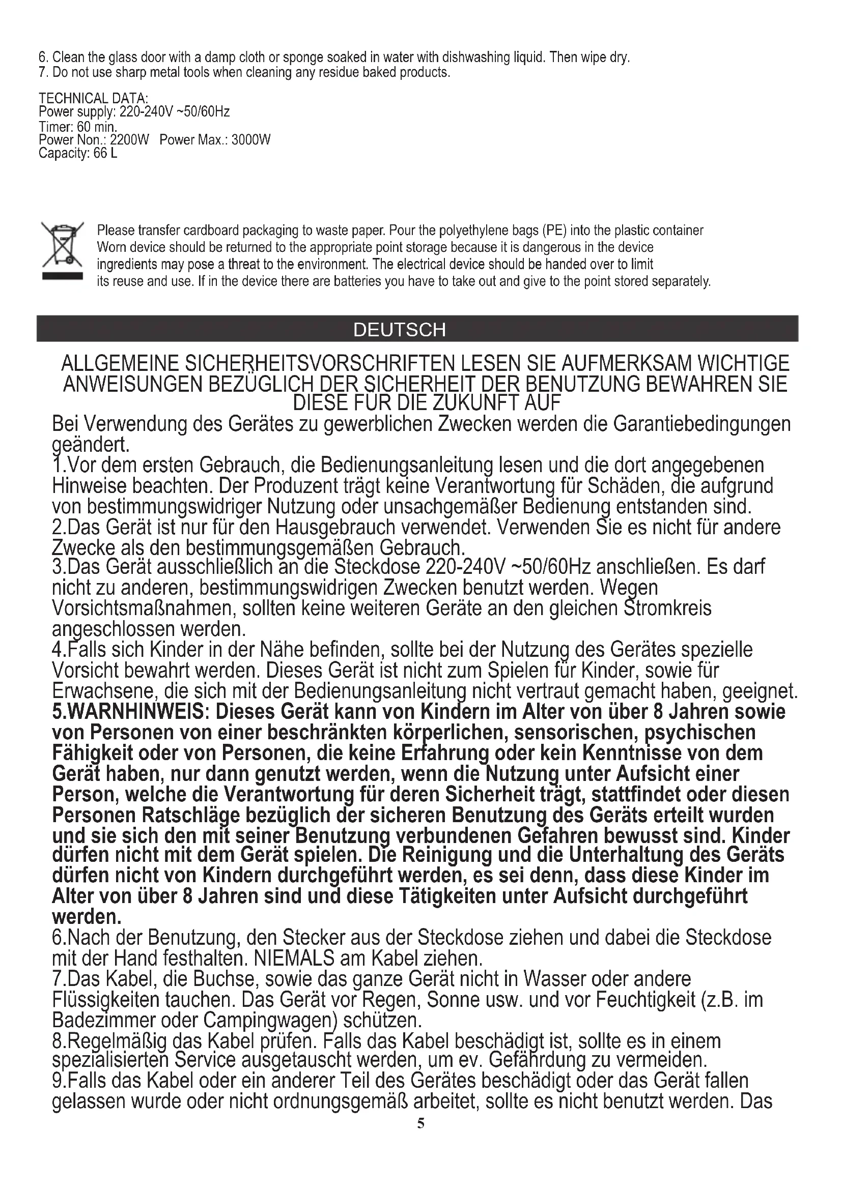 ENDE DER BENUTZUNG DES OFENS: E Timer-Bedienknopf F Griff C Wahlknopf für den Heizmodus D Kontrollleuchte Den Pappkarton im Altpapier entsorgen. Polyäthylenbeutel (PE) in dem Behälter für Kunststoff entsorgen. Das abgenutzte Gerät zum Recycling zu einer offiziellen Sammelstelle bringen, da es gefährliche Substanzen enthält, die die Umwelt gefährden können. Das Gerät sollte in einer Form abgegeben werden, die eine weitere Nutzung unmöglich macht. Wenn es Batterien enthält, sollten diese rausgenommen und separat an einer Sammelstelle abgegeben werden. Das Gerät darf nicht in den Hausmüll rausgeworfen werden!! CONSIGNES DE SECURITE. INSTRUCTIONS IMPORTANTES CONCERNANT LA SECURITE D'UTILISATION.