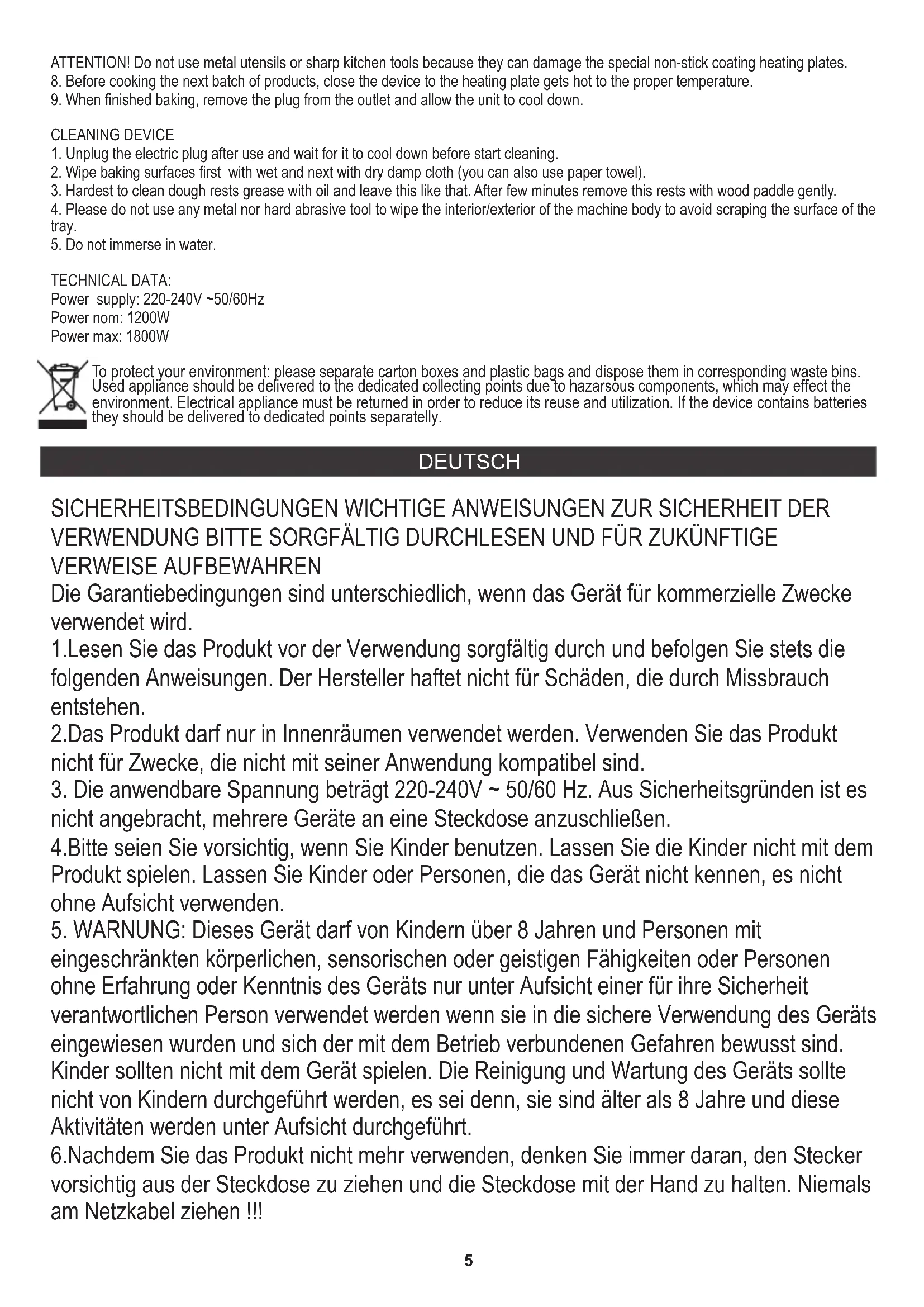 kann es nur bewegt werden, wenn genügend Zeit zum Abkühlen vorhanden ist. 24.Öffnen Sie das Gerät, indem Sie den Griff halten. Stromversorgung: 220-240 V ~ 50/60 Hz Nennleistung: 1200W TECHNISCHE DATEN: Leistungsmaximum: 1800W 5. Während des Betriebs schaltet sich die Bereitschaftsanzeigelampe (3) ein und aus. Dies bedeutet, dass der Thermostat die richtige Temperatur der Heizplatten beibehält. Bereiten Sie den Teig nach Ihrem Lieblingsrezept zu