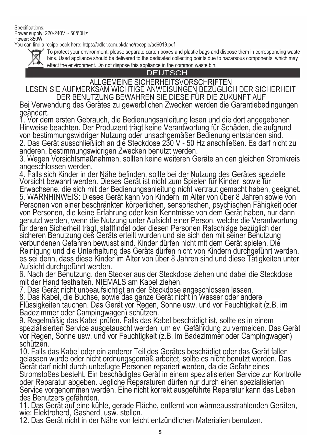 AD 6019 - Brotmaschine ADLER - Kostenlose Bedienungsanleitung