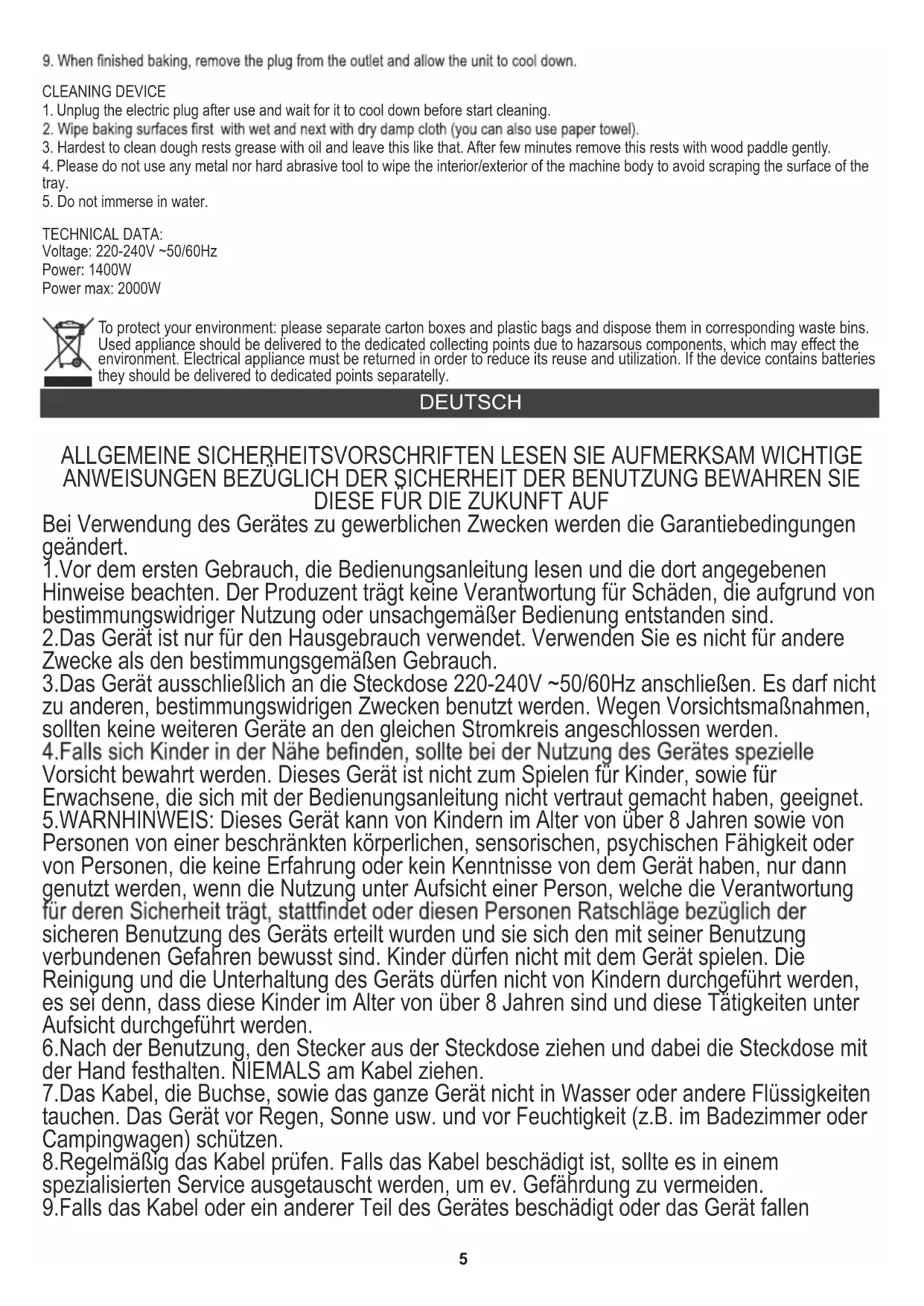 Bei Verwendung des Gerätes zu gewerblichen Zwecken werden die Garantiebedingungen geändert. 1.Vor dem ersten Gebrauch, die Bedienungsanleitung lesen und die dort angegebenen Hinweise beachten. Der Produzent trägt keine Verantwortung für Schäden, die aufgrund von bestimmungswidriger Nutzung oder unsachgemäßer Bedienung entstanden sind. 2.Das Gerät ist nur für den Hausgebrauch verwendet. Verwenden Sie es nicht für andere Zwecke als den bestimmungsgemäßen Gebrauch. 3.Das Gerät ausschließlich an die Steckdose 220-240V ~50/60Hz anschließen. Es darf nicht zu anderen, bestimmungswidrigen Zwecken benutzt werden. Wegen Vorsichtsmaßnahmen, sollten keine weiteren Geräte an den gleichen Stromkreis angeschlossen werden. Vorsicht bewahrt werden. Dieses Gerät ist nicht zum Spielen für Kinder, sowie für Erwachsene, die sich mit der Bedienungsanleitung nicht vertraut gemacht haben, geeignet. 5.WARNHINWEIS: Dieses Gerät kann von Kindern im Alter von über 8 Jahren sowie von Personen von einer beschränkten körperlichen, sensorischen, psychischen Fähigkeit oder von Personen, die keine Erfahrung oder kein Kenntnisse von dem Gerät haben, nur dann genutzt werden, wenn die Nutzung unter Aufsicht einer Person, welche die Verantwortung sicheren Benutzung des Geräts erteilt wurden und sie sich den mit seiner Benutzung verbundenen Gefahren bewusst sind. Kinder dürfen nicht mit dem Gerät spielen. Die Reinigung und die Unterhaltung des Geräts dürfen nicht von Kindern durchgeführt werden, es sei denn, dass diese Kinder im Alter von über 8 Jahren sind und diese Tätigkeiten unter Aufsicht durchgeführt werden. 6.Nach der Benutzung, den Stecker aus der Steckdose ziehen und dabei die Steckdose mit der Hand festhalten. NIEMALS am Kabel ziehen. 7.Das Kabel, die Buchse, sowie das ganze Gerät nicht in Wasser oder andere Flüssigkeiten tauchen. Das Gerät vor Regen, Sonne usw. und vor Feuchtigkeit (z.B. im Badezimmer oder Campingwagen) schützen. 8.Regelmäßig das Kabel prüfen. Falls das Kabel beschädigt ist, sollte es in einem spezialisierten Service ausgetauscht werden, um ev. Gefährdung zu vermeiden. 9.Falls das Kabel oder ein anderer Teil des Gerätes beschädigt oder das Gerät fallen6 DEUTSCH gelassen wurde oder nicht ordnungsgemäß arbeitet, sollte es nicht benutzt werden. Das Gerät darf nicht durch unbefugte Personen repariert werden, da die Gefahr eines Stromstoßes besteht. Ein beschädigtes Gerät in einem spezialisierten Service zur Kontrolle oder Reparatur abgeben. Jegliche Reparaturen dürfen nur durch einen spezialisierten Service vorgenommen werden. Eine nicht korrekt ausgeführte Reparatur kann das Leben des Benutzers gefährden. 10.Das Gerät auf eine kühle, gerade Fläche, entfernt von wärmeausstrahlenden Geräten, wie: Elektroherd, Gasherd, usw. stellen. 11.Das Gerät nicht in der Nähe von leicht entzündlichen Materialien benutzen. 12.Das Kabel darf nicht außerhalb der Tischkante hängen oder heiße Flächen berühren. 13.Lassen Sie das Gerät oder den Adapter nicht unbeaufsichtigt, wenn es an das Stromnetz angeschlossen ist. 14.Es wird empfohlen, für zusätzlichen Schutz den Fehlerstromschutzschalter (RCD), dessen Bemessungsdifferenzstrom 30 mA nicht übersteigt, zu installieren. In diesem Bereich wenden Sie sich an einen Fachelektriker.