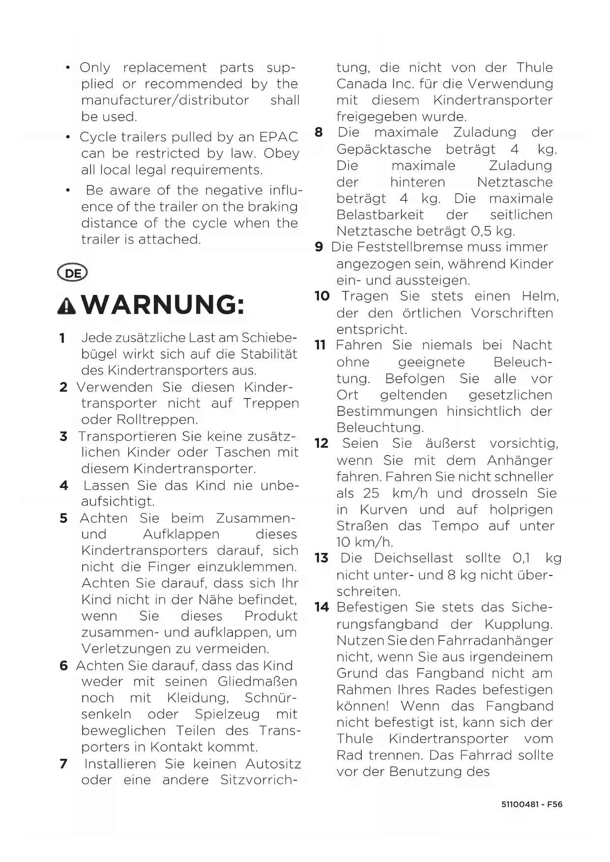 - Lesen Sie vor Benutzung dieses Produkts die Bedienungsanleitung und die Warnhinweise und stellen Sie sicher, dass Sie sie verstehen.• Prüfen Sie vor der Benutzung des Produkts, welche örtlichen Vorschriften dafür gelten, wo und wie das Produkt verwendet werden darf.• Bei der Verwendung des Transporters mit dem Fahrrad-Set von Thule beachten Sie bitte auch die Bedienungsanleitung des Fahrrads, mit dem Sie den Transporter verwenden möchten, und halten Sie sich an die Vorgaben bezüglich der maximal zulässigen Belastung für das Fahrrad.• Dieser Transporter ist für den Transport von Kindern auf Bürgersteigen, auf öentlichen Straßen mit wenig Verkehr und auf möglichst ebenem Untergrund bei Tageslicht bestimmt.• Bei schlechter Beleuchtung wird die Verwen-dung einer Sicherheitsleuchte empfohlen. Beachten Sie Folgendes: