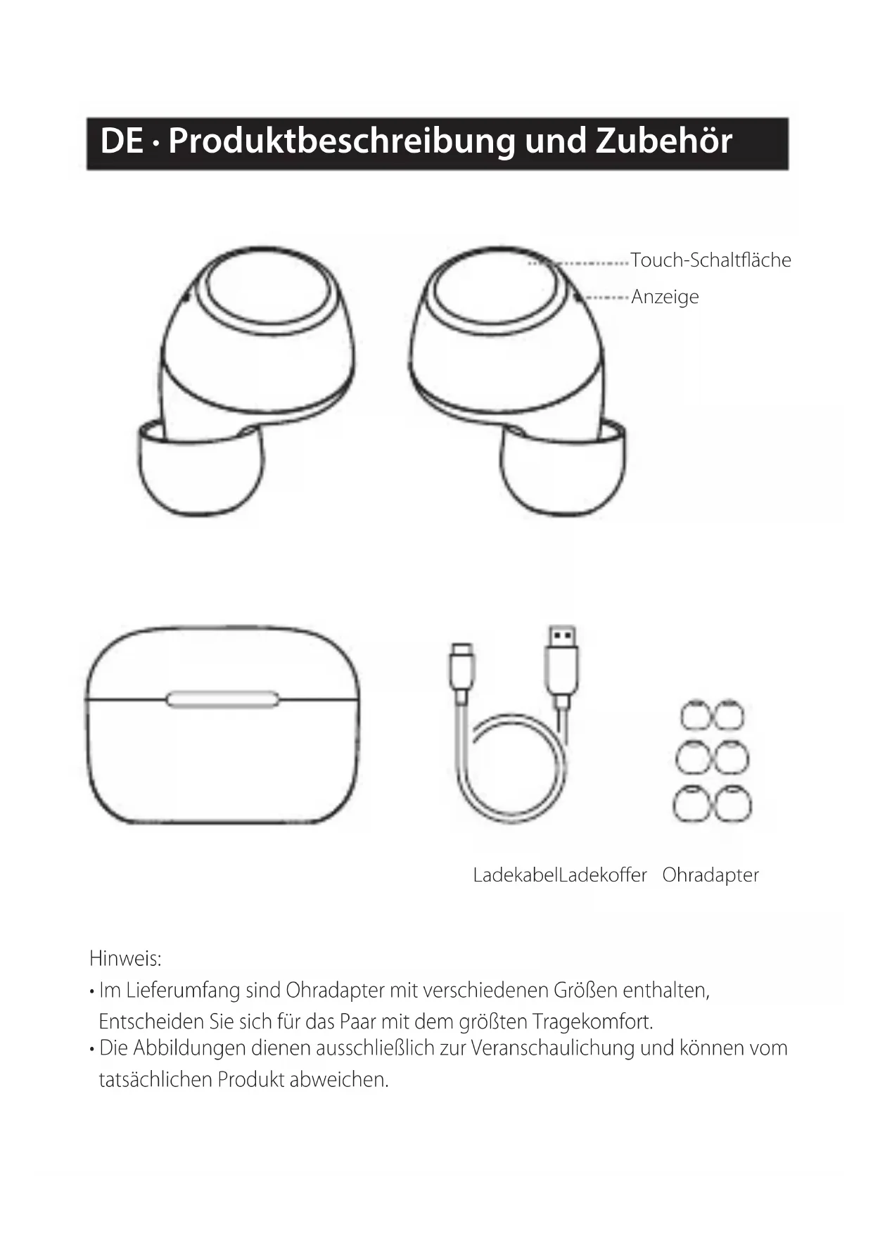 - Die Abbildungen dienen ausschließlich zur Veranschaulichung und können vom tatsächlichen Produkt abweichen. LadekabelLadekoffer Ohradapter Anzeige Touch-Schaltfläche● Laden Sie die Ohrhörer auf Achtung: Die aufladbaren Batterien, die Strom für dieses Produkt zur Verfügung stellen, müssen korrekt für das Recycling entsorgt werden. Werfen Sie Akkus nicht ins Feuer, um der Gefahr einer Explosion vorzubeugen. ■ Bedienungsanleitung