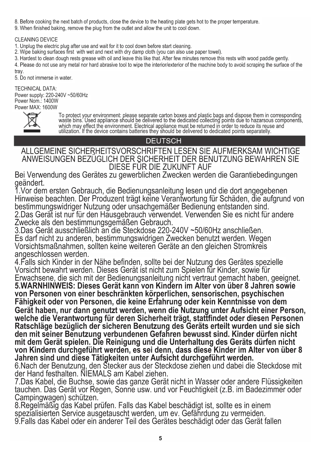 3. Hardest to clean dough rests grease with oil and leave this like that. After few minutes remove this rests with wood paddle gently. 4. Please do not use any metal nor hard abrasive tool to wipe the interior/exterior of the machine body to avoid scraping the surface of the tray. Power supply: 220-240V ~50/60Hz Power Nom.: 1400W TECHNICAL DATA: Power MAX: 1600W To protect your environment: please separate carton boxes and plastic bags and dispose them in corresponding waste bins. Used appliance should be delivered to the dedicated collecting points due to hazarsous components, which may effect the environment. Electrical appliance must be returned in order to reduce its reuse and utilization. If the device contains batteries they should be delivered to dedicated points separatelly. DEUTSCH 3.Das Gerät ausschließlich an die Steckdose 220-240V ~50/60Hz anschließen. 4.Falls sich Kinder in der Nähe befinden, sollte bei der Nutzung des Gerätes spezielle Vorsicht bewahrt werden. Dieses Gerät ist nicht zum Spielen für Kinder, sowie für Erwachsene, die sich mit der Bedienungsanleitung nicht vertraut gemacht haben, geeignet. 1.Vor dem ersten Gebrauch, die Bedienungsanleitung lesen und die dort angegebenen Hinweise beachten. Der Produzent trägt keine Verantwortung für Schäden, die aufgrund von bestimmungswidriger Nutzung oder unsachgemäßer Bedienung entstanden sind. Bei Verwendung des Gerätes zu gewerblichen Zwecken werden die Garantiebedingungen geändert. 2.Das Gerät ist nur für den Hausgebrauch verwendet. Verwenden Sie es nicht für andere Zwecke als den bestimmungsgemäßen Gebrauch. Es darf nicht zu anderen, bestimmungswidrigen Zwecken benutzt werden. Wegen Vorsichtsmaßnahmen, sollten keine weiteren Geräte an den gleichen Stromkreis angeschlossen werden. 5.WARNHINWEIS: Dieses Gerät kann von Kindern im Alter von über 8 Jahren sowie von Personen von einer beschränkten körperlichen, sensorischen, psychischen Fähigkeit oder von Personen, die keine Erfahrung oder kein Kenntnisse von dem Gerät haben, nur dann genutzt werden, wenn die Nutzung unter Aufsicht einer Person, welche die Verantwortung für deren Sicherheit trägt, stattfindet oder diesen Personen Ratschläge bezüglich der sicheren Benutzung des Geräts erteilt wurden und sie sich den mit seiner Benutzung verbundenen Gefahren bewusst sind. Kinder dürfen nicht mit dem Gerät spielen. Die Reinigung und die Unterhaltung des Geräts dürfen nicht von Kindern durchgeführt werden, es sei denn, dass diese Kinder im Alter von über 8 Jahren sind und diese Tätigkeiten unter Aufsicht durchgeführt werden.