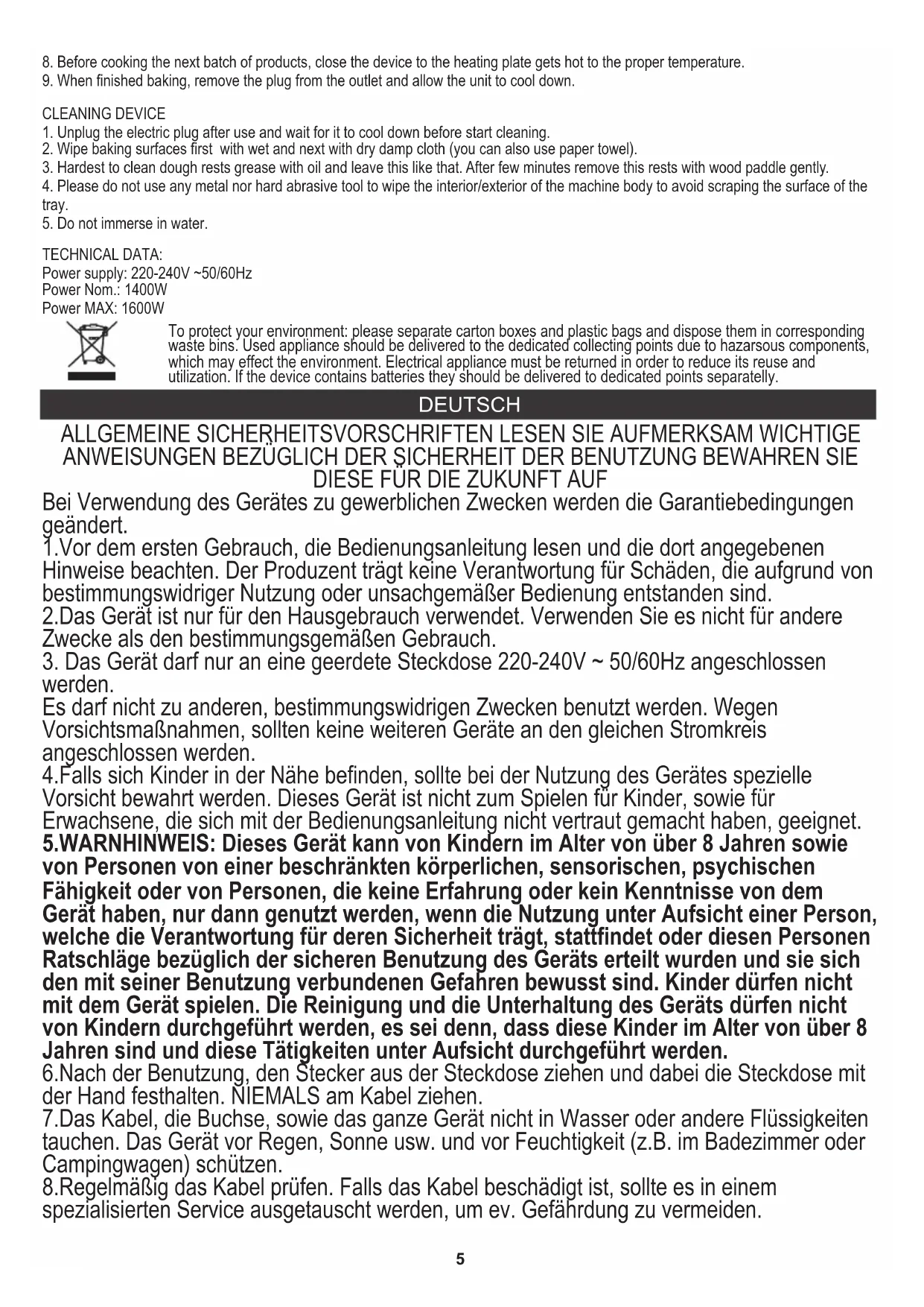 Plastikküchenschaufel. 5. Während des Betriebs des Gerätes wird die Thermostat-Kontrolllampe (2) aufleuchten und löschen - der Thermostat hält die entsprechende Temperatur der Heizplatten. 3. Schmieren Sie die schwer entfernbaren Reste mit etwas Essöl und entfernen nach einigen Minuten mit der hölzernen Schaufel. Den Pappkarton im Altpapier entsorgen. Polyäthylenbeutel (PE) in dem Behälter für Kunststoff entsorgen. Das abgenutzte Gerät zum Recycling zu einer offiziellen Sammelstelle bringen, da es gefährliche Substanzen enthält, die die Umwelt gefährden können. Das Gerät sollte in einer Form abgegeben werden, die eine weitere Nutzung unmöglich macht. Wenn es Batterien enthält, sollten diese rausgenommen und separat an einer Sammelstelle abgegeben werden. Das Gerät darf nicht in den Hausmüll rausgeworfen werden!! FRANÇAIS 6.Après chaque utilisation, débrancher la fiche d'alimentation de la prise de courant, en maintenant la prise avec la main. Ne pas tirer sur le cordon d'alimentation.