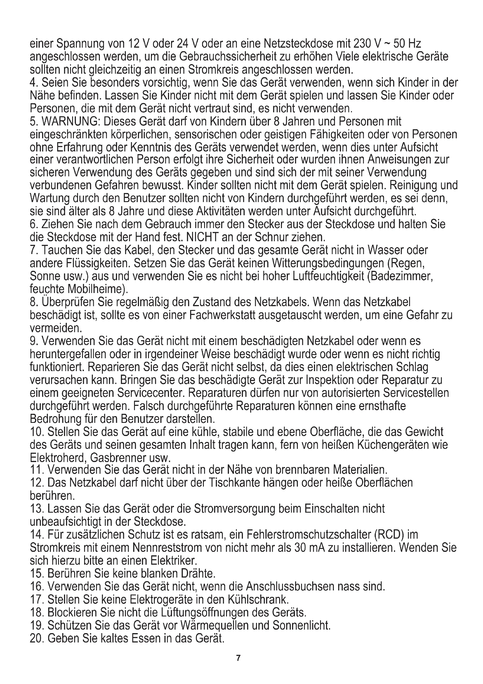 4. Dieser tragbare Kühlschrank ist für die Verwendung im Auto und für Campingzwecke geeignet. Das Gerät darf jedoch weder Regen noch anderen Unwetterelementen ausgesetzt werden. 5. Dieser tragbare Kühlschrank darf nicht in einem eingebauten oder vertieften Bereich aufgestellt werden. Das Gerät ist freistehend ausgelegt.