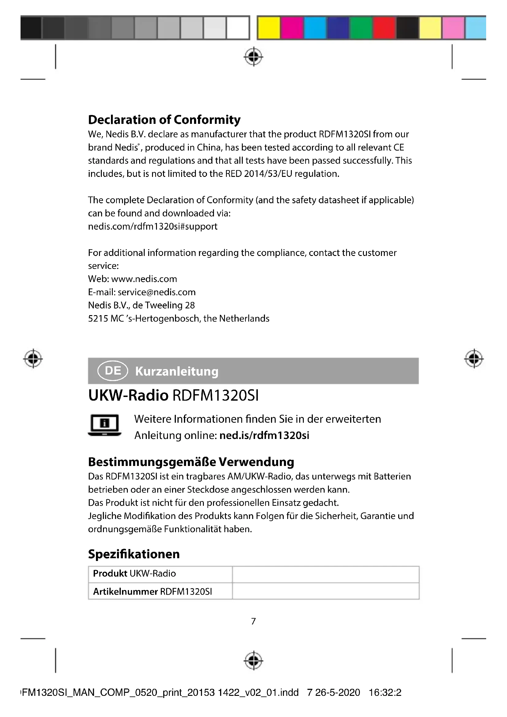 zeigt die aktuelle Frequenz an. RDFM1320SI_MAN_COMP_0520_print_20153 1422_v02_01.indd 10 26-5-2020 16:32:2111 Konformitätserklärung Wir, Nedis B.V., erklären als Hersteller, dass das Produkt RDFM1320SI unserer Marke Nedis