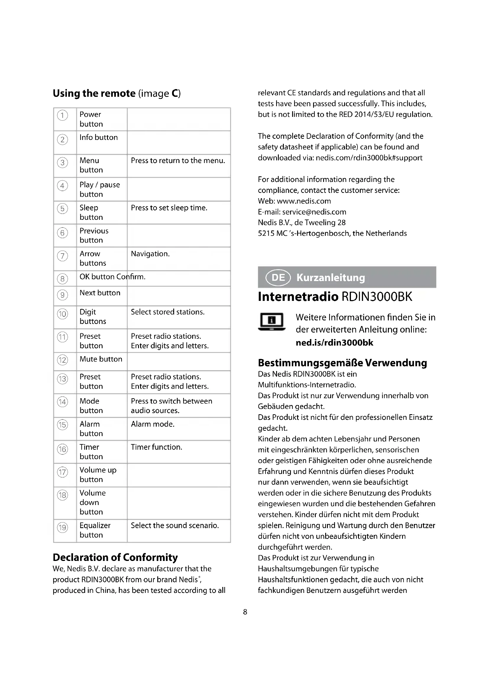 Kurzanleitung Internetradio RDIN3000BK Weitere Informationen finden Sie in der erweiterten Anleitung online: ned.is/rdin3000bk Bestimmungsgemäße Verwendung Das Nedis RDIN3000BK ist ein Multifunktions-Internetradio. Das Produkt ist nur zur Verwendung innerhalb von Gebäuden gedacht. Das Produkt ist nicht für den professionellen Einsatz gedacht. Kinder ab dem achten Lebensjahr und Personen mit eingeschränkten körperlichen, sensorischen oder geistigen Fähigkeiten oder ohne ausreichende Erfahrung und Kenntnis dürfen dieses Produkt nur dann verwenden, wenn sie beaufsichtigt werden oder in die sichere Benutzung des Produkts eingewiesen wurden und die bestehenden Gefahren verstehen. Kinder dürfen nicht mit dem Produkt spielen. Reinigung und Wartung durch den Benutzer dürfen nicht von unbeaufsichtigten Kindern durchgeführt werden. Das Produkt ist zur Verwendung in Haushaltsumgebungen für typische Haushaltsfunktionen gedacht, die auch von nicht fachkundigen Benutzern ausgeführt werden Using the remote (image C)