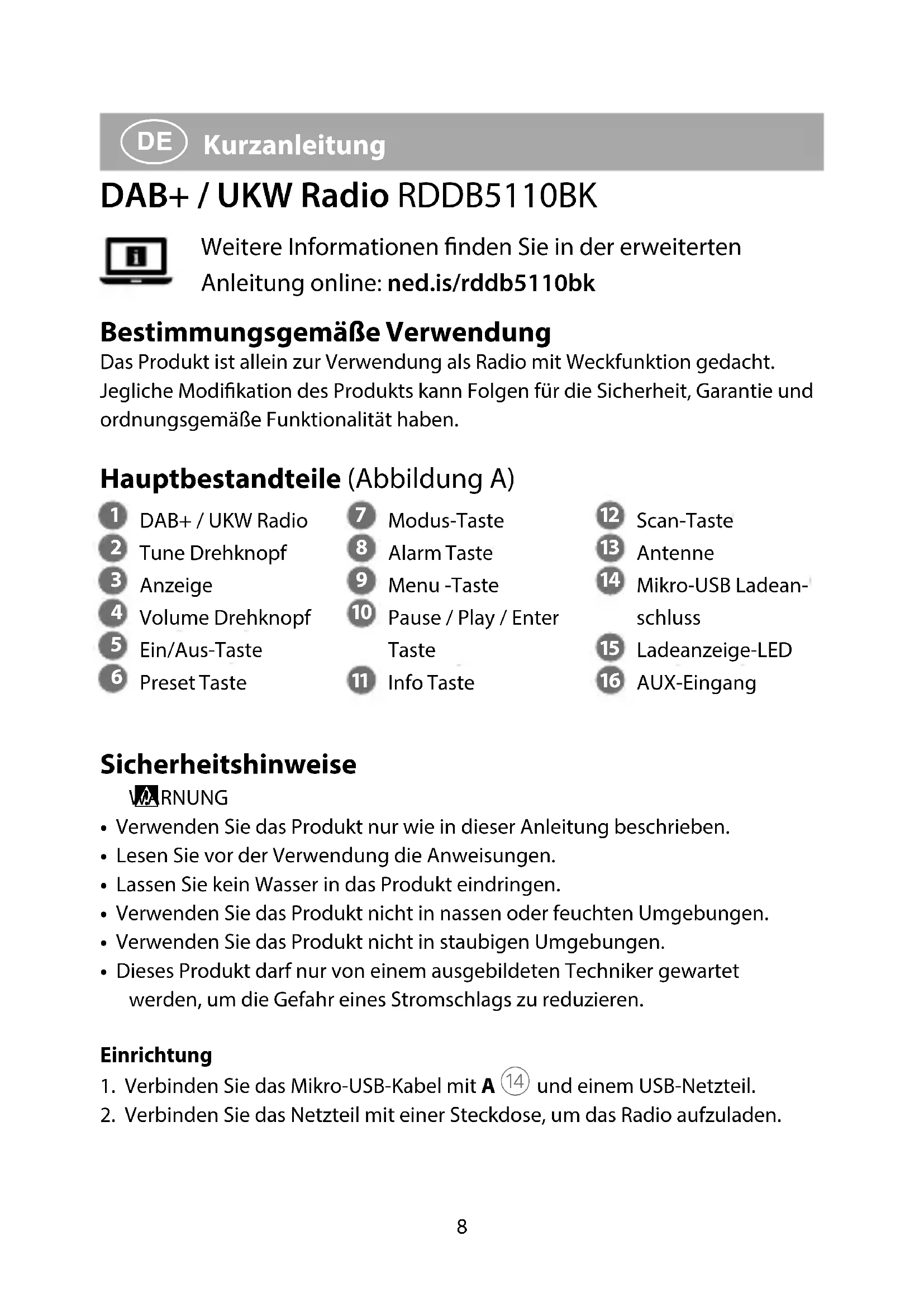 Kurzanleitung DAB+ / UKW Radio RDDB5110BK Weitere Informationen nden Sie in der erweiterten Anleitung online: ned.is/rddb5110bk Bestimmungsgemäße Verwendung Das Produkt ist allein zur Verwendung als Radio mit Weckfunktion gedacht.Jegliche Modikation des Produkts kann Folgen für die Sicherheit, Garantie und ordnungsgemäße Funktionalität haben. Hauptbestandteile (Abbildung A)