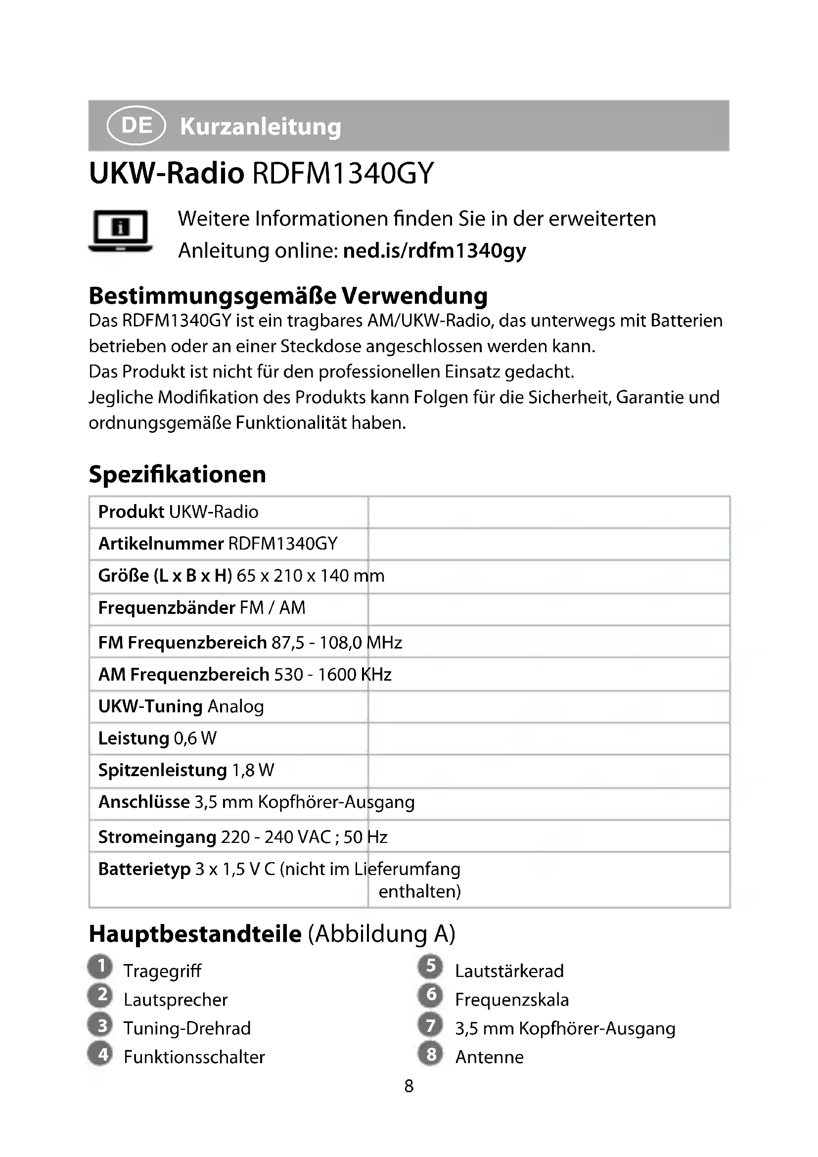 Kurzanleitung UKW-Radio RDFM1340GY Weitere Informationen nden Sie in der erweiterten Anleitung online: ned.is/rdfm1340gy Bestimmungsgemäße Verwendung Das RDFM1340GY ist ein tragbares AM/UKW-Radio, das unterwegs mit Batterien betrieben oder an einer Steckdose angeschlossen werden kann. Das Produkt ist nicht für den professionellen Einsatz gedacht. Jegliche Modikation des Produkts kann Folgen für die Sicherheit, Garantie und ordnungsgemäße Funktionalität haben. Spezikationen Produkt UKW-Radio Artikelnummer RDFM1340GY Größe (L x B x H) 65 x 210 x 140 mm Frequenzbänder FM / AM FM Frequenzbereich 87,5 - 108,0 MHz AM Frequenzbereich 530 - 1600 KHz UKW-Tuning Analog Leistung 0,6 W Spitzenleistung 1,8 W Anschlüsse 3,5 mm Kopfhörer-Ausgang Stromeingang 220 - 240 VAC ; 50 Hz Batterietyp 3 x 1,5 V C (nicht im Lieferumfang enthalten) Hauptbestandteile (Abbildung A)
