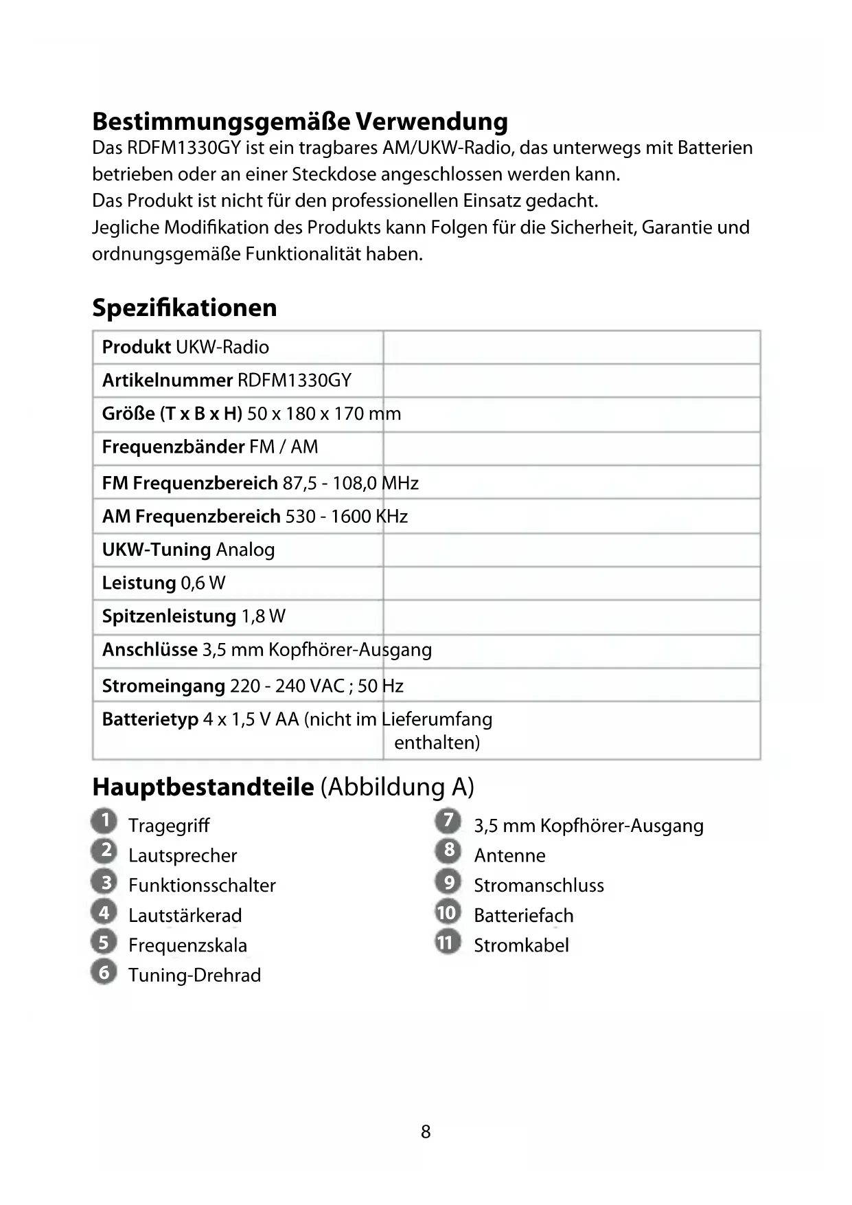 Kurzanleitung UKW-Radio RDFM1330GY Weitere Informationen nden Sie in der erweiterten Anleitung online: ned.is/rdfm1330gy8 Bestimmungsgemäße Verwendung Das RDFM1330GY ist ein tragbares AM/UKW-Radio, das unterwegs mit Batterien betrieben oder an einer Steckdose angeschlossen werden kann. Das Produkt ist nicht für den professionellen Einsatz gedacht. Jegliche Modikation des Produkts kann Folgen für die Sicherheit, Garantie und ordnungsgemäße Funktionalität haben. Spezikationen Produkt UKW-Radio Artikelnummer RDFM1330GY Größe (T x B x H) 50 x 180 x 170 mm Frequenzbänder FM / AM FM Frequenzbereich 87,5 - 108,0 MHz AM Frequenzbereich 530 - 1600 KHz UKW-Tuning Analog Leistung 0,6 W Spitzenleistung 1,8 W Anschlüsse 3,5 mm Kopfhörer-Ausgang Stromeingang 220 - 240 VAC ; 50 Hz Batterietyp 4 x 1,5 V AA (nicht im Lieferumfang enthalten) Hauptbestandteile (Abbildung A)