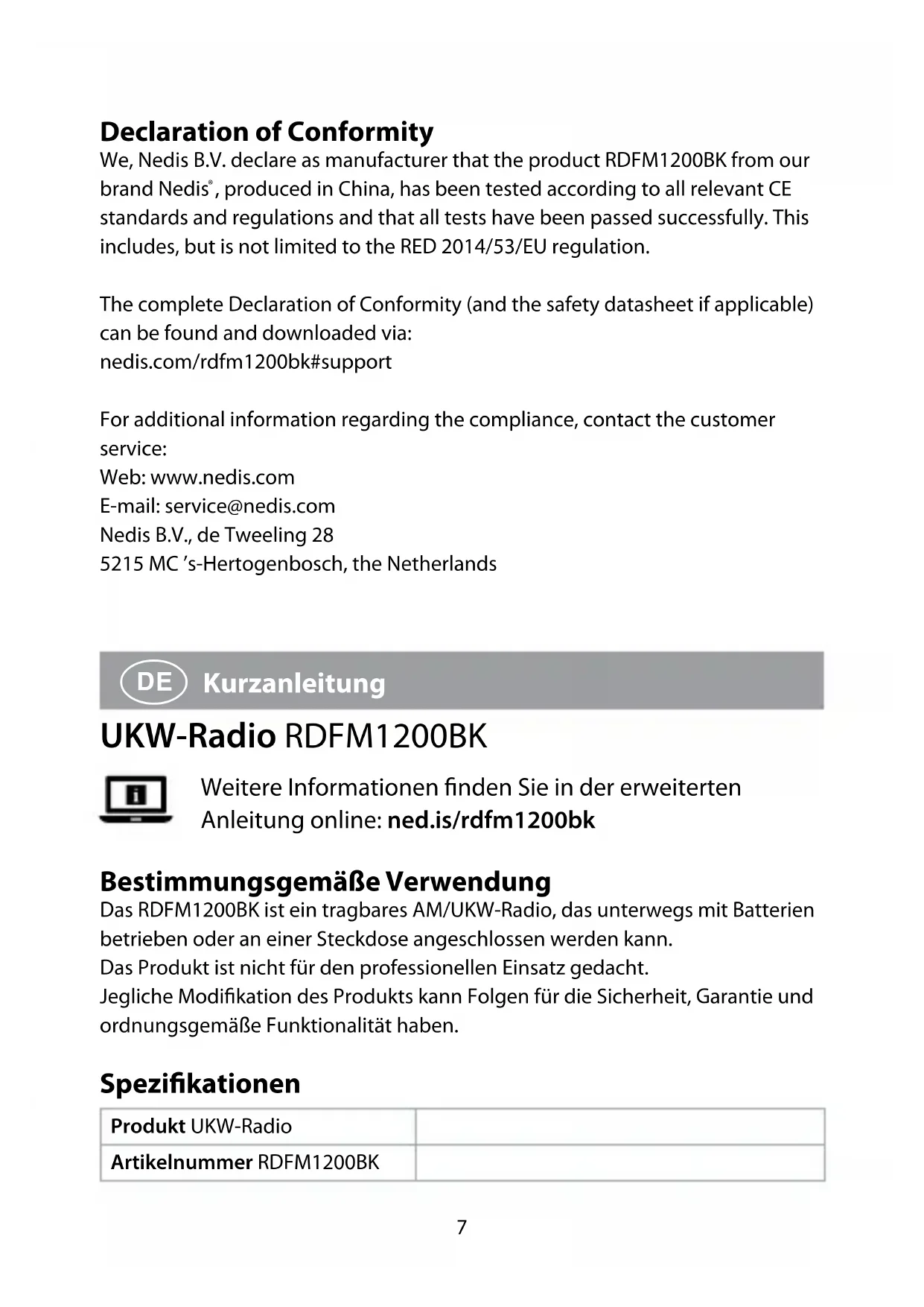 heraus, um den Empfang im UKW-Modus zu verbessern. Konformitätserklärung Wir, Nedis B.V., erklären als Hersteller, dass das Produkt RDFM1200BK unserer Marke Nedis