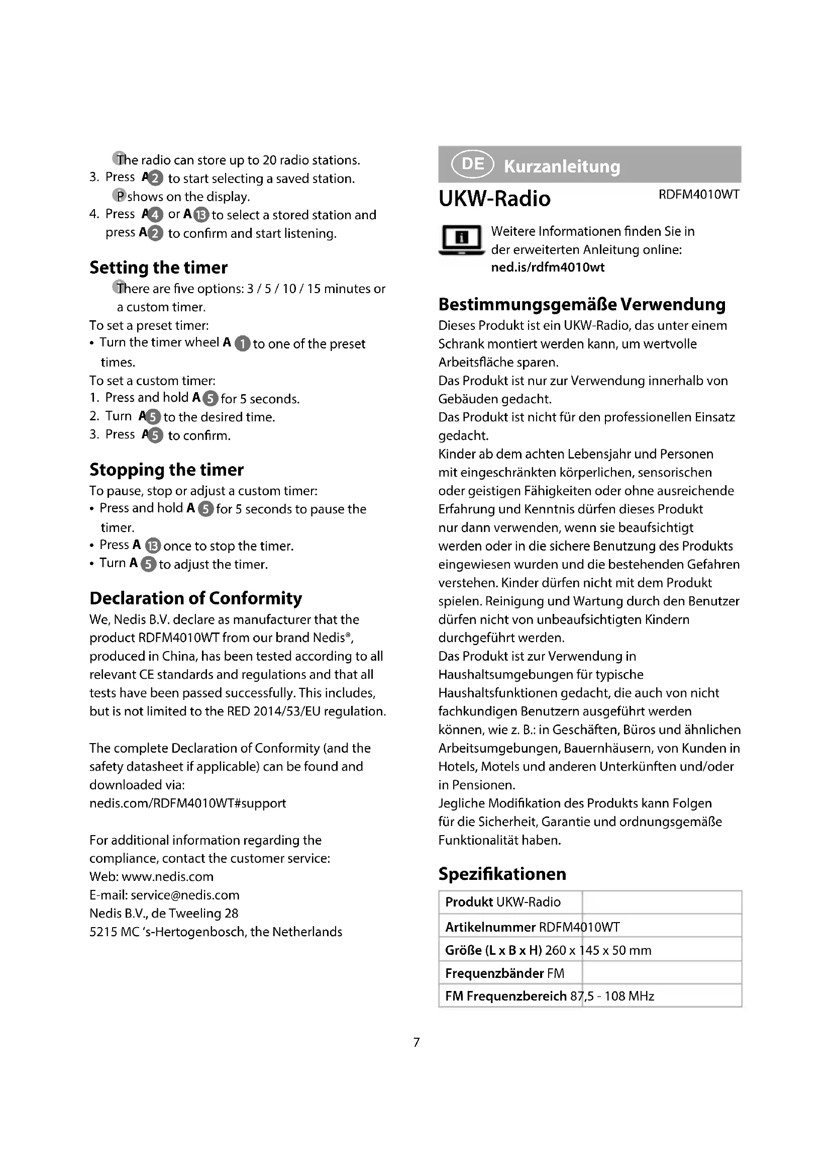 There are ve options: 3 / 5 / 10 / 15 minutes or a custom timer.To set a preset timer:• Turn the timer wheel A to one of the preset times.To set a custom timer:1. Press and hold A for 5 seconds.2. Turn A to the desired time.3. Press A to conrm. Stopping the timer To pause, stop or adjust a custom timer:• Press and hold A for 5 seconds to pause the timer.• Press A once to stop the timer.• Turn A to adjust the timer. Declaration of Conformity We, Nedis B.V. declare as manufacturer that the product RDFM4010WT from our brand Nedis®, produced in China, has been tested according to all relevant CE standards and regulations and that all tests have been passed successfully. This includes, but is not limited to the RED 2014/53/EU regulation.The complete Declaration of Conformity (and the safety datasheet if applicable) can be found and downloaded via:nedis.com/RDFM4010WT#supportFor additional information regarding the compliance, contact the customer service:Web: www.nedis.comE-mail: service@nedis.comNedis B.V., de Tweeling 285215 MC ’s-Hertogenbosch, the Netherlands8