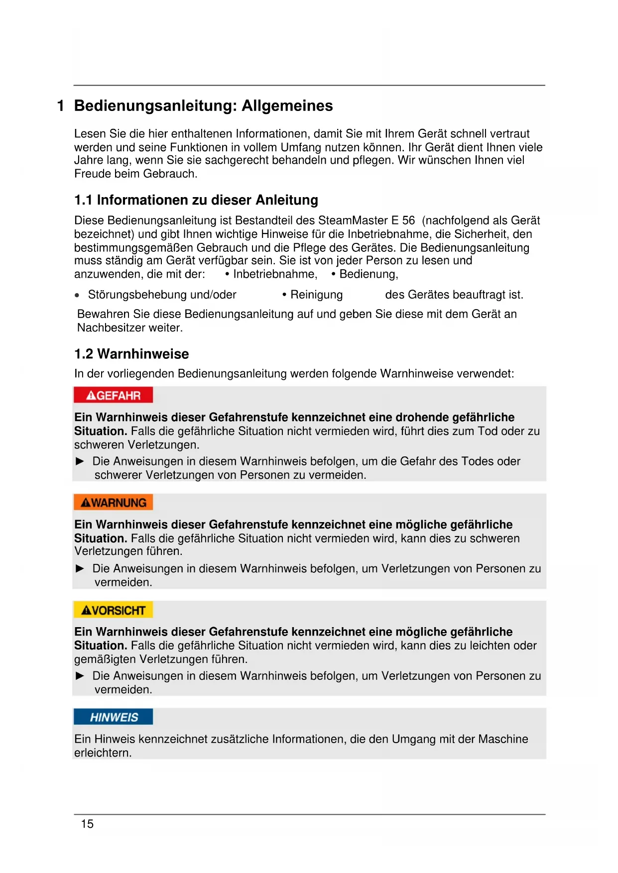 Diese Bedienungsanleitung ist Bestandteil des SteamMaster E 56 (nachfolgend als Gerät bezeichnet) und gibt Ihnen wichtige Hinweise für die Inbetriebnahme, die Sicherheit, den bestimmungsgemäßen Gebrauch und die Pflege des Gerätes. Die Bedienungsanleitung muss ständig am Gerät verfügbar sein. Sie ist von jeder Person zu lesen und anzuwenden, die mit der: Inbetriebnahme, Bedienung,