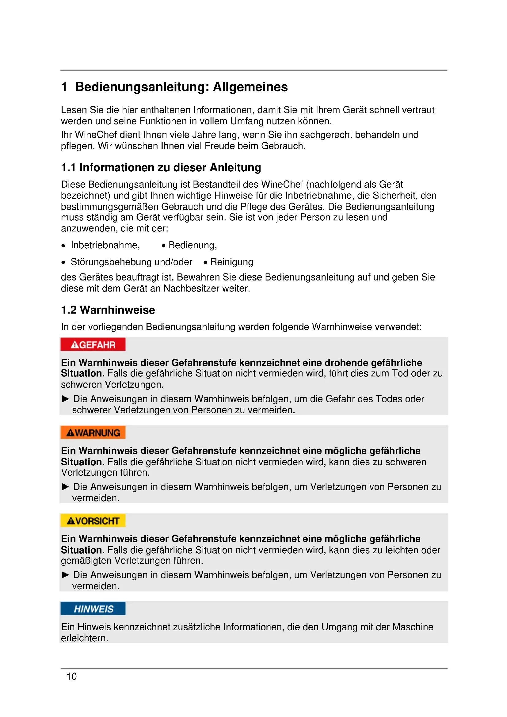 Diese Bedienungsanleitung ist Bestandteil des WineChef (nachfolgend als Gerät bezeichnet) und gibt Ihnen wichtige Hinweise für die Inbetriebnahme, die Sicherheit, den bestimmungsgemäßen Gebrauch und die Pflege des Gerätes. Die Bedienungsanleitung muss ständig am Gerät verfügbar sein. Sie ist von jeder Person zu lesen und anzuwenden, die mit der: