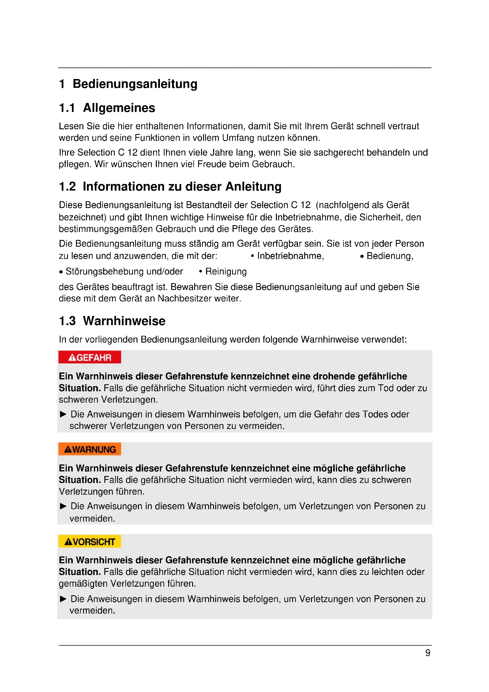 Diese Bedienungsanleitung ist Bestandteil der Selection C 12 (nachfolgend als Gerät bezeichnet) und gibt Ihnen wichtige Hinweise für die Inbetriebnahme, die Sicherheit, den bestimmungsgemäßen Gebrauch und die Pflege des Gerätes. Die Bedienungsanleitung muss ständig am Gerät verfügbar sein. Sie ist von jeder Person zu lesen und anzuwenden, die mit der: Inbetriebnahme, • Bedienung,