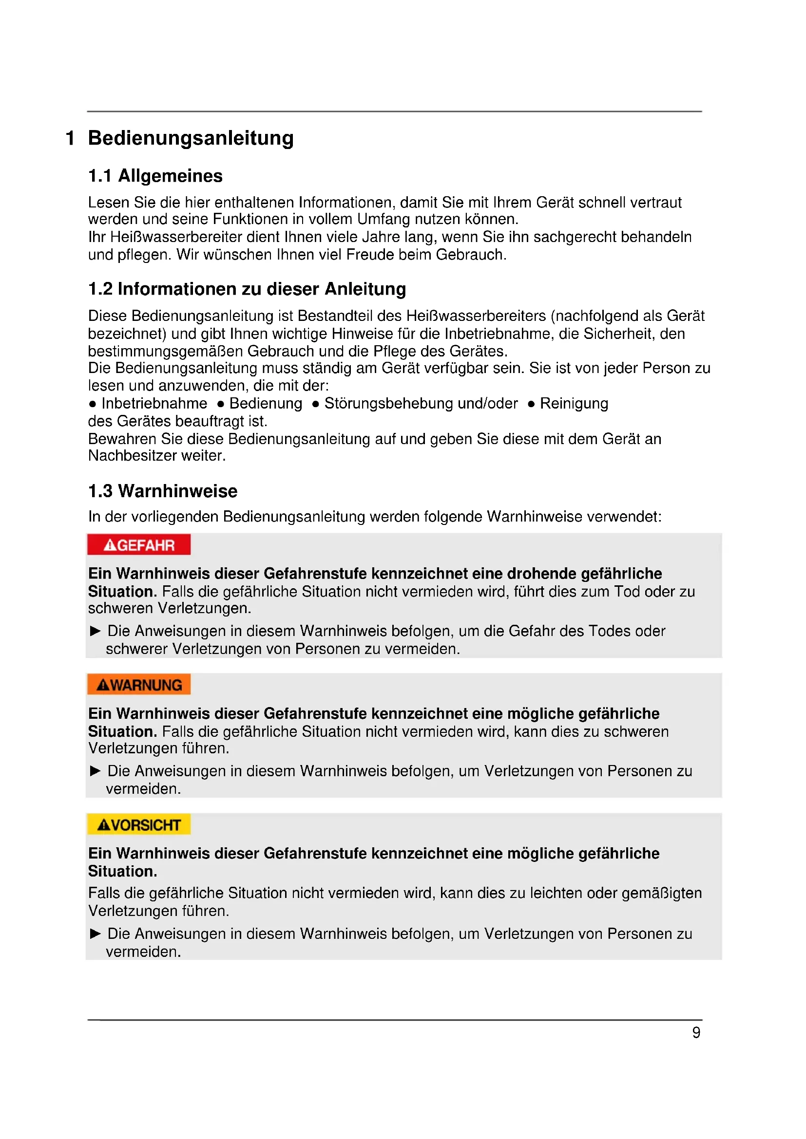Diese Bedienungsanleitung ist Bestandteil des Heißwasserbereiters (nachfolgend als Gerät bezeichnet) und gibt Ihnen wichtige Hinweise für die Inbetriebnahme, die Sicherheit, den bestimmungsgemäßen Gebrauch und die Pflege des Gerätes. Die Bedienungsanleitung muss ständig am Gerät verfügbar sein. Sie ist von jeder Person zu lesen und anzuwenden, die mit der: ● Inbetriebnahme ● Bedienung ● Störungsbehebung und/oder ● Reinigung des Gerätes beauftragt ist. Bewahren Sie diese Bedienungsanleitung auf und geben Sie diese mit dem Gerät an Nachbesitzer weiter.