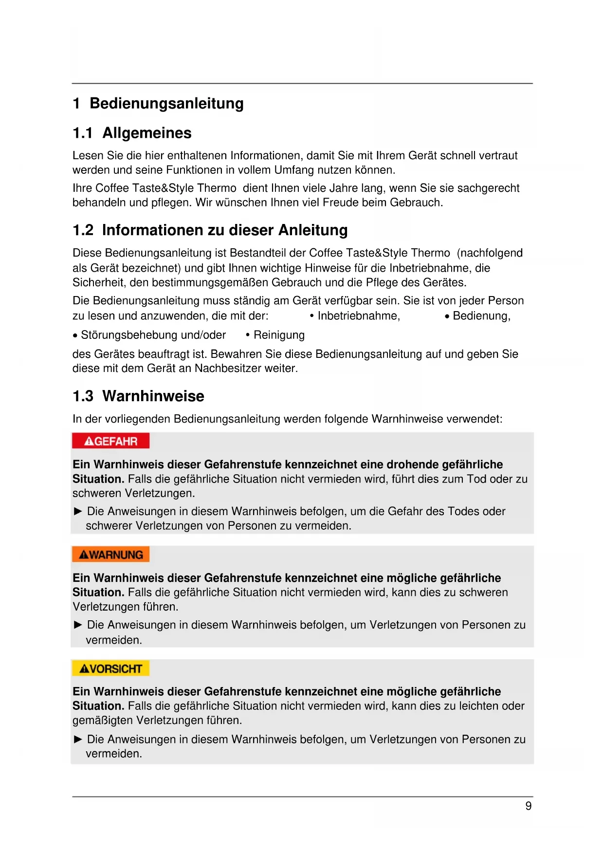 Diese Bedienungsanleitung ist Bestandteil der Coffee Taste&Style Thermo (nachfolgend als Gerät bezeichnet) und gibt Ihnen wichtige Hinweise für die Inbetriebnahme, die Sicherheit, den bestimmungsgemäßen Gebrauch und die Pflege des Gerätes. Die Bedienungsanleitung muss ständig am Gerät verfügbar sein. Sie ist von jeder Person zu lesen und anzuwenden, die mit der: Inbetriebnahme, • Bedienung,